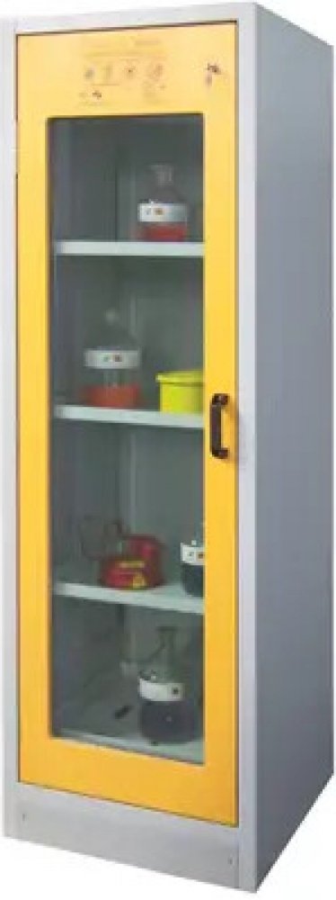 Tato vrianta s průhlednými dveřmi s protipožárním sklem zajišťují vyšší přehlednost obsahu skříně a umožňují rychlou kontrolu stavu a množství skladovaných chemikálií.