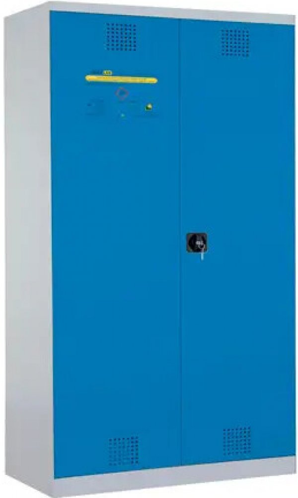 Skříň je vybavena uzamykatelnými křídlovými dveřmi, které jsou zesílené v místě zámku. Větrací otvory podporují přirozenou výměnu vzduchu uvnitř skříně.