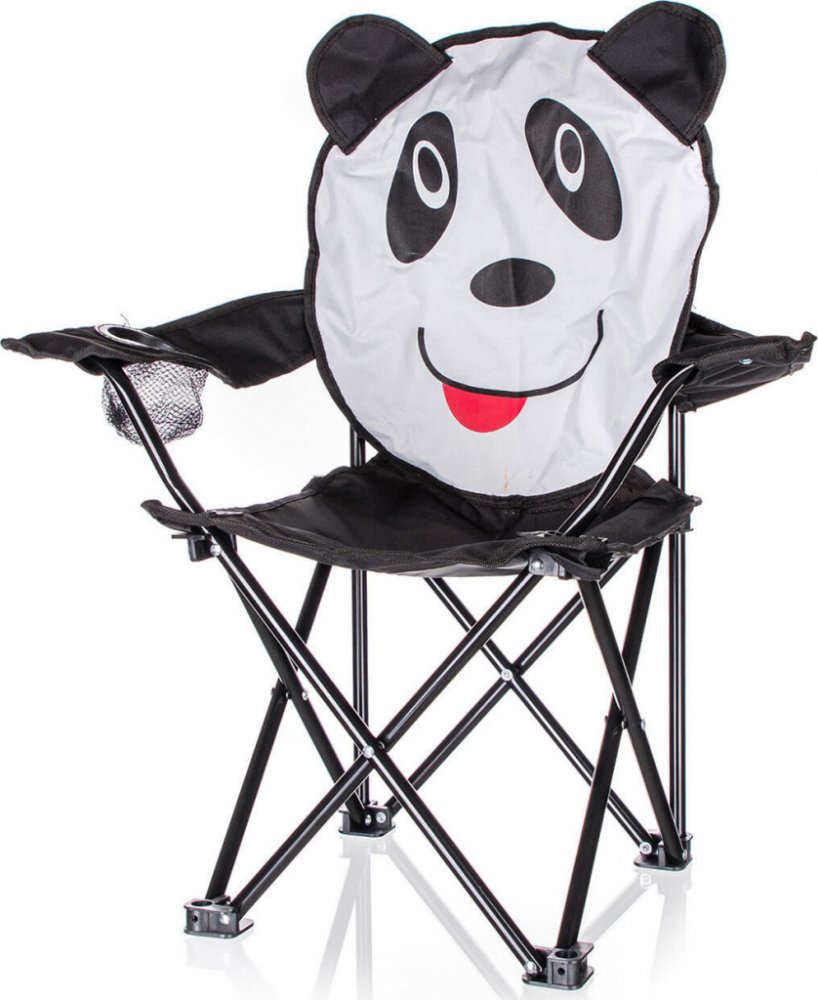 Křeslo s dětským motivem pandy, kovová rozkládací konstrukce, šířka 57 cm, hloubka 36,5 cm, výška 66 cm, průměr trubek 13 mm, nosnost 30 kg, hmotnost 1,04 kg, materiál ocel + polyester.