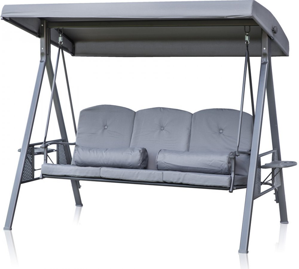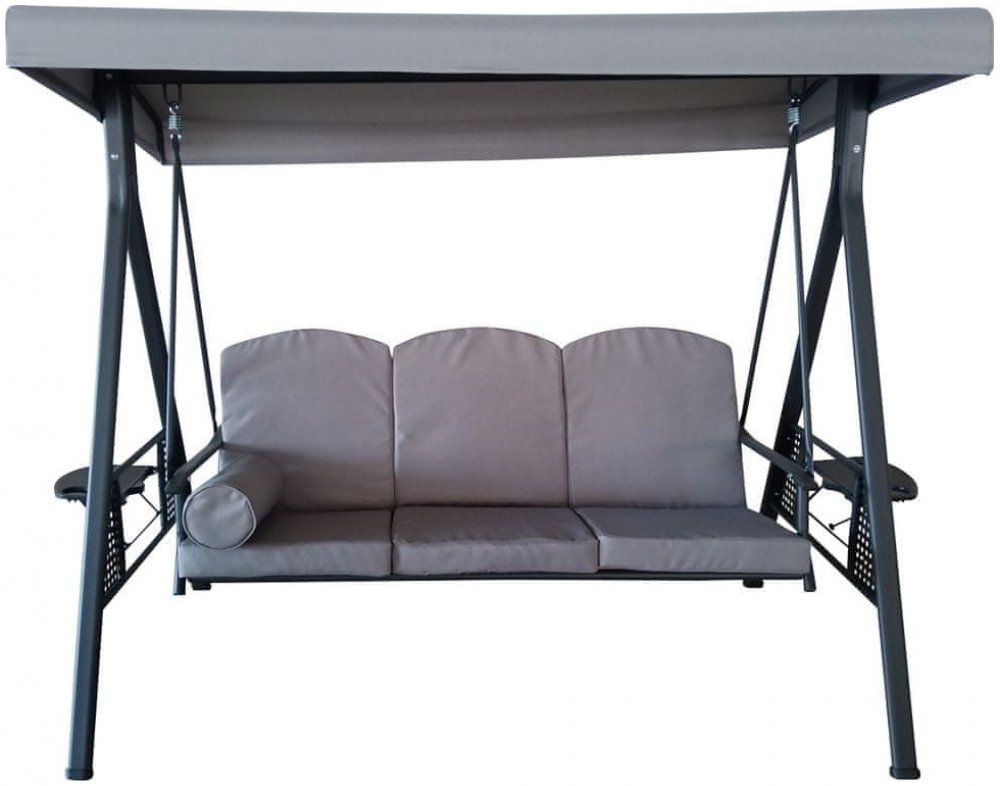 Zahradní houpačka RUJANA má vysoce stabilní masivní kovovou konstrukci, ošetřenou práškovým lakováním a 3 samostatné sedáky z polyesteru o síle cca 8 cm, které zajišťují komfortní posezení. Rozměry houpačky: 200 x 116 x 173 cm, nosnost 300 kg. Dalšími výhodami této houpačky je nastavitelná stříška proti slunci, doplňkový kulatý polštářek pro dokonalý relax a také dva výklopné stolky po stranách ho...