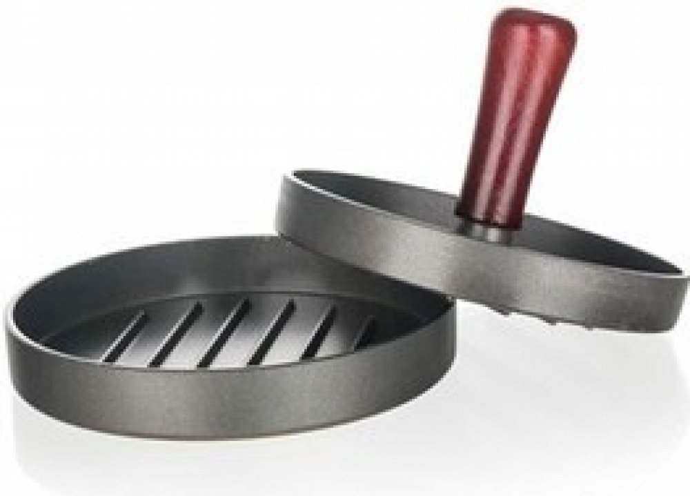 \nForma na výrobu hamburgerů z mletého masa vyrobená z litého hliníku a opatřená nepřilnavým povrchem doplněna dřevěným madlem, průměr 12 cm, celková výška 8 cm.\n
