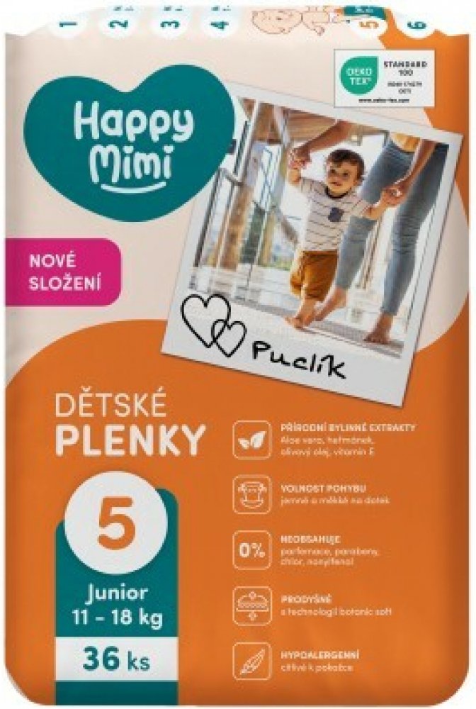 Happy Mimi – Nové dětské plenky s přírodní péčí Objevte nové jednorázové plenky Happy Mimi s inovativním složením, které spojuje jemnost, bezpečí a přírodní sílu bylin. Díky extraktům z Aloe vera, heřmánku, olivového oleje a vitaminu E poskytují šetrnou péči dětské pokožce. - VOLNOST POHYBU – Plenky jsou navrženy tak, aby neomezovaly pohyb a umožnily vašemu miminku svobodně objevovat svět. - Jemné a měkké na dotek – Extra hebký povrch pro maximální pohodlí. - PRODYŠNÉ – S technologií Botanic Soft pro zdravou cirkulaci vzduchu. - HYPOALERGENNÍ – Citlivé k pokožce, vhodné i pro děti se sklony k alergiím. - 0 % parfemace, parabeny, chlor, nonylfenol – Bez zbytečné chemie, pouze to nejlepší pro vaše dítě. - EXTRA SAVÉ - Mají zvýšenou absorpční schopnost pro pohodlí citlivé dětské pokožky. Anatomicky tvarované flexibilní pásky umožňují volný pohyb a současně zabraňují úniku tekutiny. Elastické manžety s praktickým suchým zipem udrží plenku na správném místě přes den i během spánku. Příprava a použití: Rozevřete plenku a uvolněte lepící pásek. Vytáhněte do vysoka přední část plenky a připevněte lepící pásek na vzorkovanou část. Dbejte na to, aby se lepící pásky uchytily symetricky. Po použití můžete plenku stočením zavřít a znovu přelepit lepící páskou.