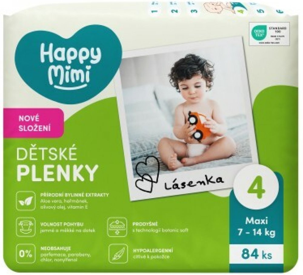 Happy Mimi – Nové dětské plenky s přírodní péčí v ekonomickém velkém balení Objevte nové jednorázové plenky Happy Mimi s inovativním složením, které spojuje jemnost, bezpečí a přírodní sílu bylin. Díky extraktům z Aloe vera, heřmánku, olivového oleje a vitaminu E poskytují šetrnou péči dětské pokožce. - VOLNOST POHYBU – Plenky jsou navrženy tak, aby neomezovaly pohyb a umožnily vašemu miminku svobodně objevovat svět. - Jemné a měkké na dotek – Extra hebký povrch pro maximální pohodlí. - PRODYŠNÉ – S technologií Botanic Soft pro zdravou cirkulaci vzduchu. - HYPOALERGENNÍ – Citlivé k pokožce, vhodné i pro děti se sklony k alergiím. - 0 % parfemace, parabeny, chlor, nonylfenol – Bez zbytečné chemie, pouze to nejlepší pro vaše dítě. - EXTRA SAVÉ - Mají zvýšenou absorpční schopnost pro pohodlí citlivé dětské pokožky. Anatomicky tvarované flexibilní pásky umožňují volný pohyb a současně zabraňují úniku tekutiny. Elastické manžety s praktickým suchým zipem udrží plenku na správném místě přes den i během spánku. Příprava a použití: Rozevřete plenku a uvolněte lepící pásek. Vytáhněte do vysoka přední část plenky a připevněte lepící pásek na vzorkovanou část. Dbejte na to, aby se lepící pásky uchytily symetricky. Po použití můžete plenku stočením zavřít a znovu přelepit lepící páskou.