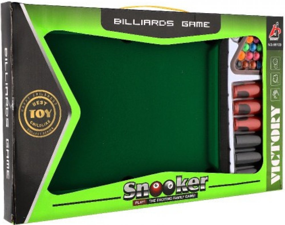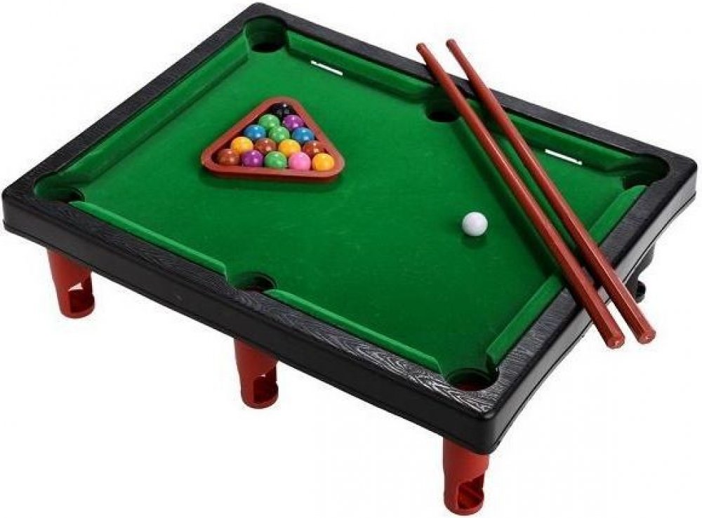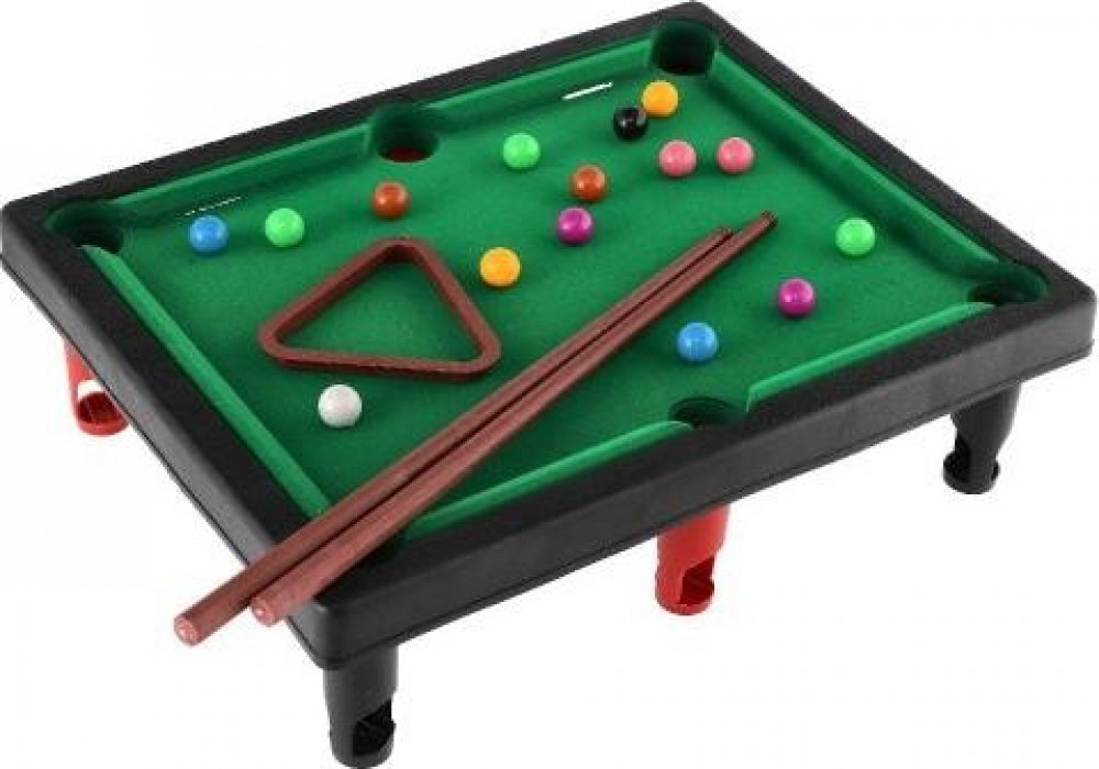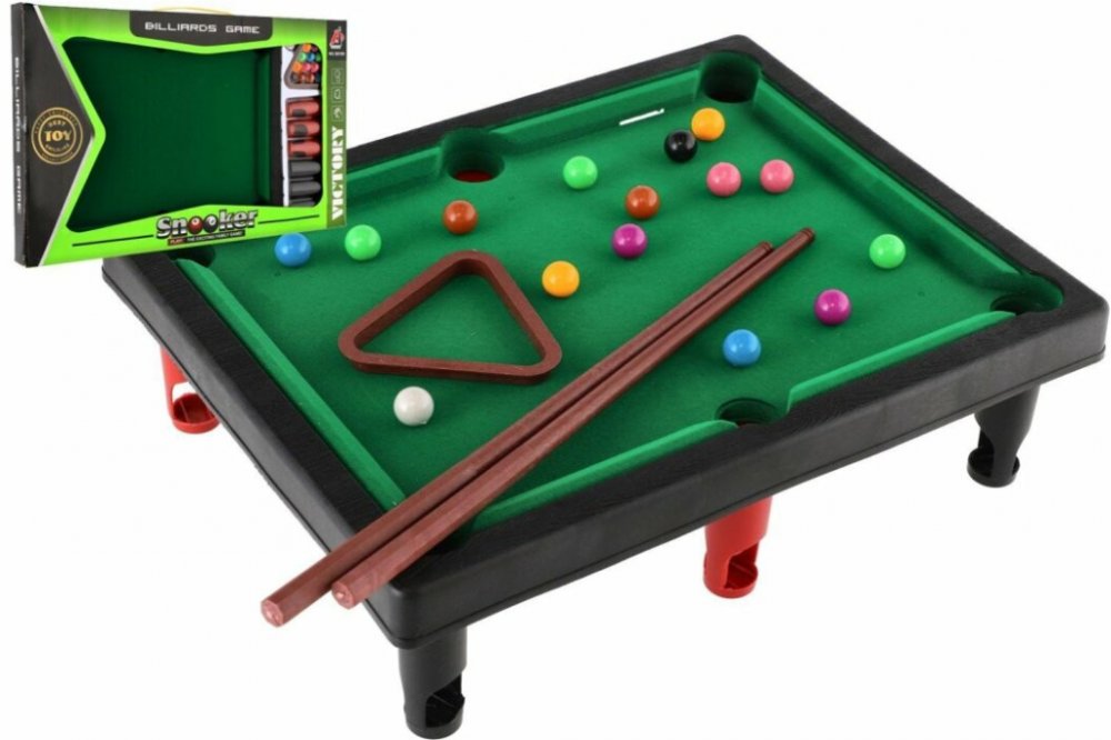 Dětský stolní kulečník je věrnou zmenšeninou klasického kulečníku. Stačí hru položit na stůl nebo jakoukoliv jinou rovnou plochu a hra může začít! Nechybí ani triangl pro srovnání koulí. Tento malý kulečníkový stůl je určen pro zábavu a trénuje motoriku a koordinaci rukou a očí. Velikost složeného kulečníku 33 x 26 x 10 cm.