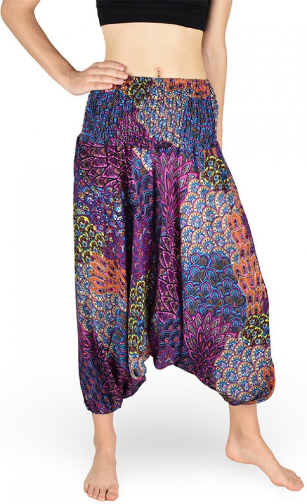 Trendy turecké (harémové) kalhoty, vícebarevné, velmi slušivé a pohodlné.Popis: elastický pas se žabkováním, gumička na konci nohavic, snížený sed, široké nohavice.