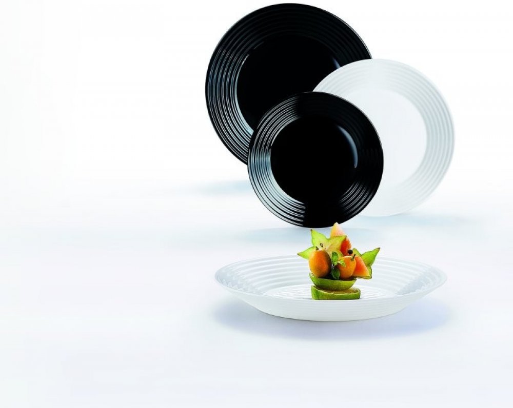Série Harena je vyrobena z tvrzeného skla, které podléhá specifickému tepelnému zpracování a tím zaručuje lepší kvalitu a odolnost proti nárazům. Sklo je neporézní materiál, proto nezachovává žádné mikroorganismy a je 100% hygienický. Jídelní souprava je charakterizována vzorem / razítkem na okrajích. Může se dávat do mikrovlnné trouby i myčky nádobí.Mělký talíř - černá barva, Hluboký talíř - bíl...