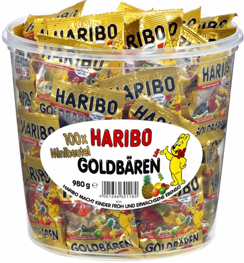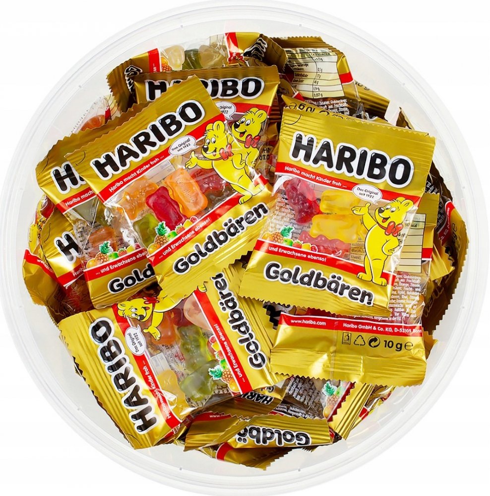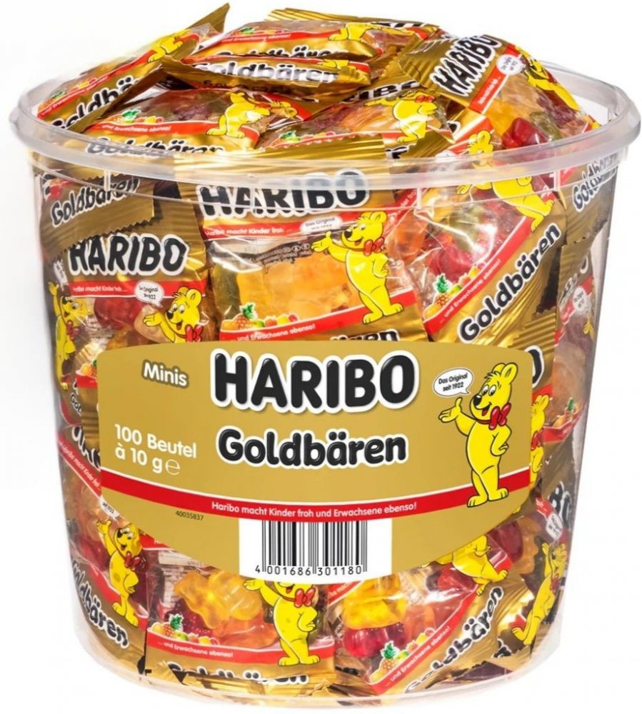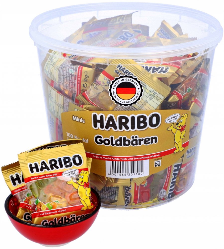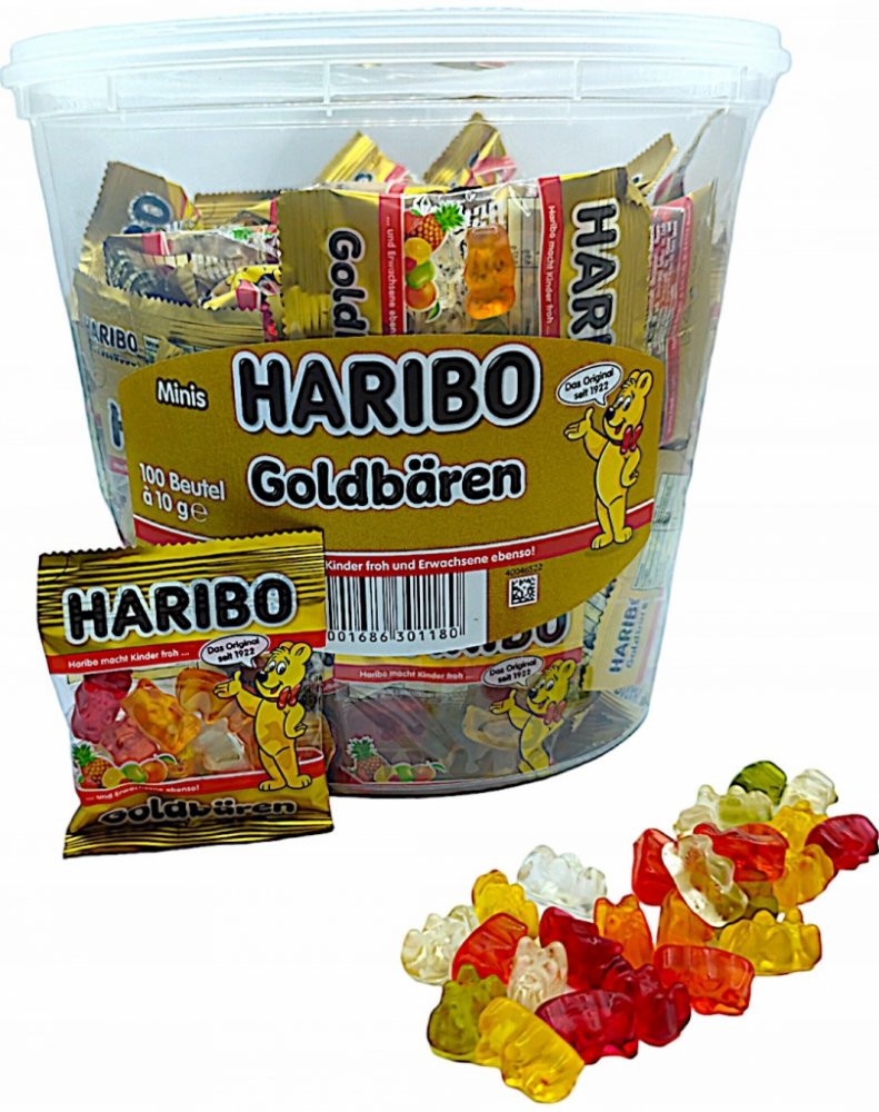 Haribo Goldbären Mini 100x10g přináší sladkou radost v každém malém balení. S osvěžující ovocnou chutí a typickou pružnou konzistencí se tento produkt stal ikonou HARIBO již více než 100 let. Mini verze o hmotnosti 10 g je ideální pro každou příležitost – od večírků a dárků až po sladké chvíle každý den.