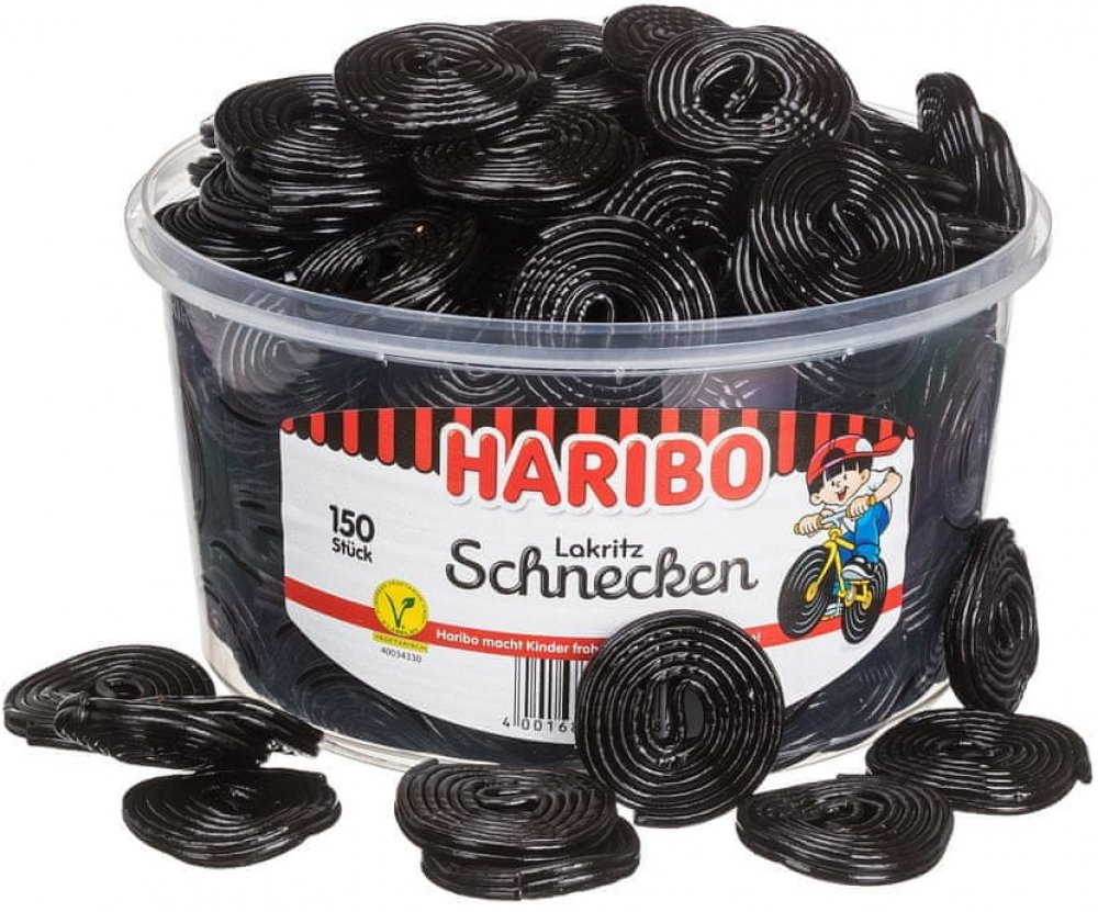 Haribo lékořicoví šneci box 150ks 1500g, 150ks v plastovém boxu Obsah balení: 1500 g (150 ks) Složení: Hnědý cukrový sirup, pšenice, glukózový sirup, škrob, extrakt z lékořice (3 %), aroma, kuchyňská sůl; Leštící látky: včelí vosk bílý a žlutý, karnaubský vosk Výživové hodnoty na 100 g: Energie: 1343 kJ/317 kcal Tuk: < 0,7 g z toho nasycené mastné kyseliny: 0,2 g Sacharidy: 74 g z toho cukry: 47 g Bílkoviny: 3,0 g Sůl: 1,2 g Země původu Německo