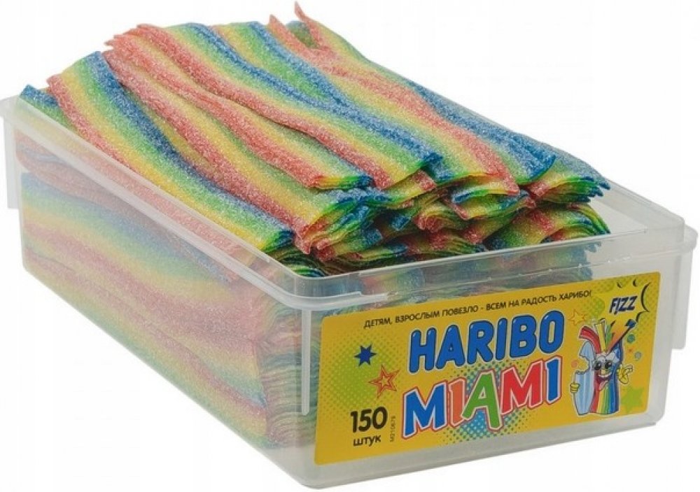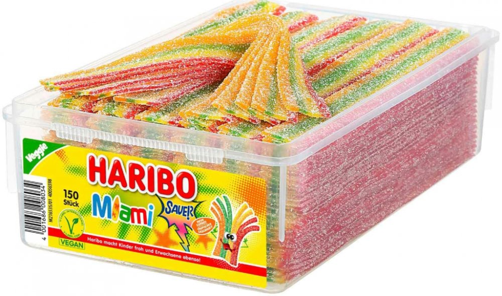 Haribo Miami kyselé pásky 1125g Balení obsahuje 150 ks (150×22,5g) Složení: cukr; Glukózový sirup; škrob; Zvlhčovadla: sorbitolový sirup; voda; PŠENICE; Acidifier: kyselina citrónová, kyselina jablečná; Regulátory kyselosti: citrát vápenatý, hydrogen-malát sodný; Nátěr: karnaubský vosk; Emulgátor:…