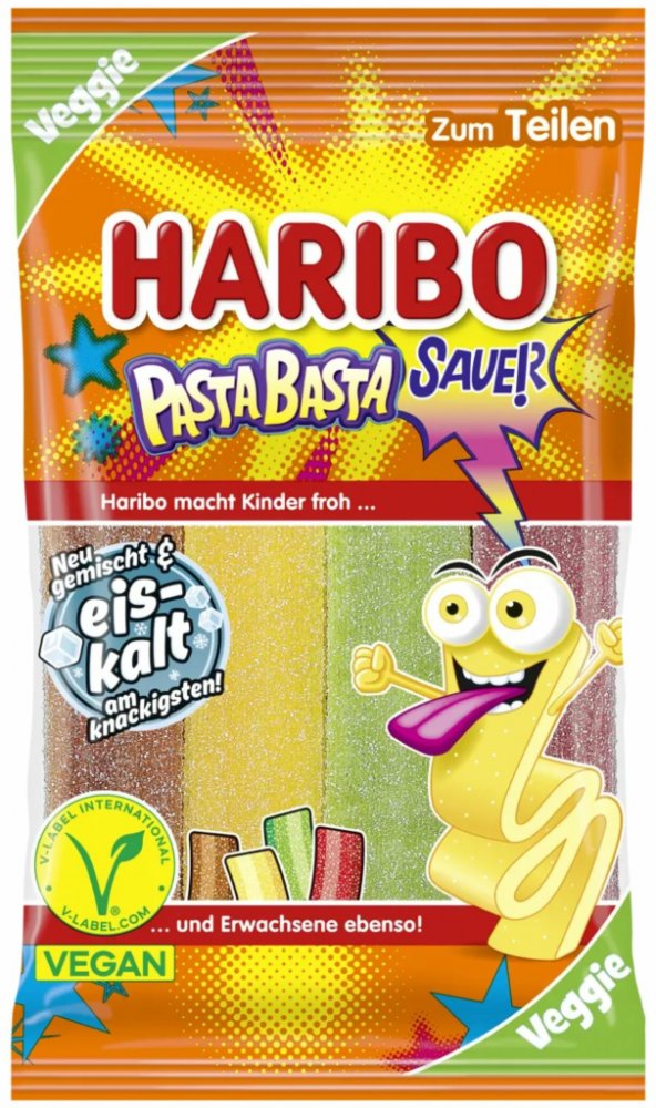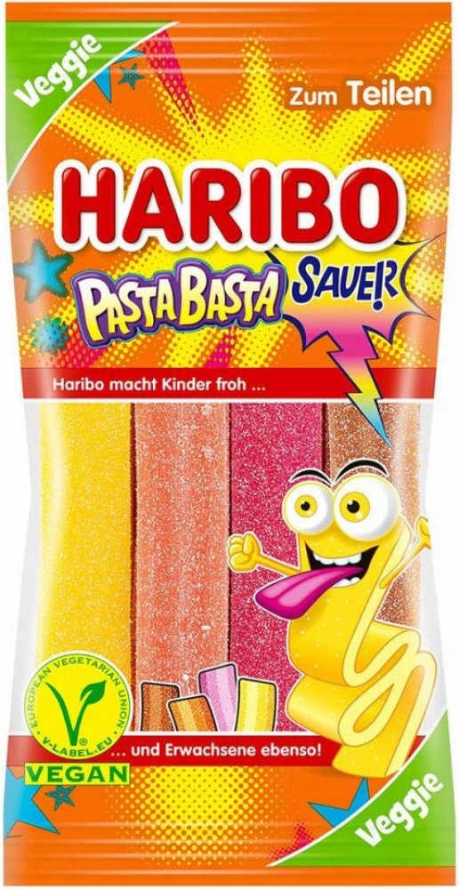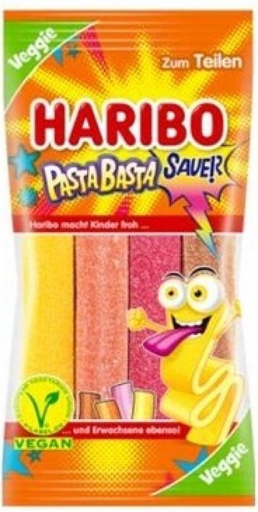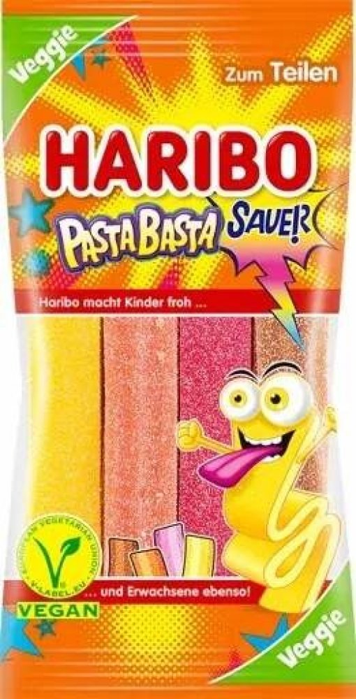 Super kyselá zábava při mlsání! S Haribo Pasta Basta sour veggie můžete očekávat živou změnu ve 4 lahodných odrůdách. Osvěžující proužky ovocné žvýkačky jsou nádherně kyselé a chutnají po kolové, tropické, třešňové a malinové. Díky veganské receptuře mohou zabodovat s čistě rostlinnými surovinami.