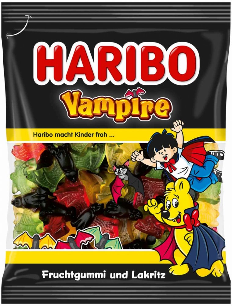 Haribo upíři jsou lahodnou kombinací lékořicového a ovocného želé v barevných variantách. S křidélky ze šťavnatého ovocného želé a tělem z jemné, kořenité lékořice vás roztomilý netopýří "klan" naučí, jak se chvět s chutí. Zakousněte se do sladkostí nebo je vášnivě cucejte – tato kombinace svádí všechny generace.