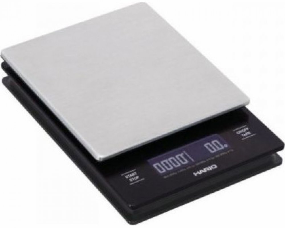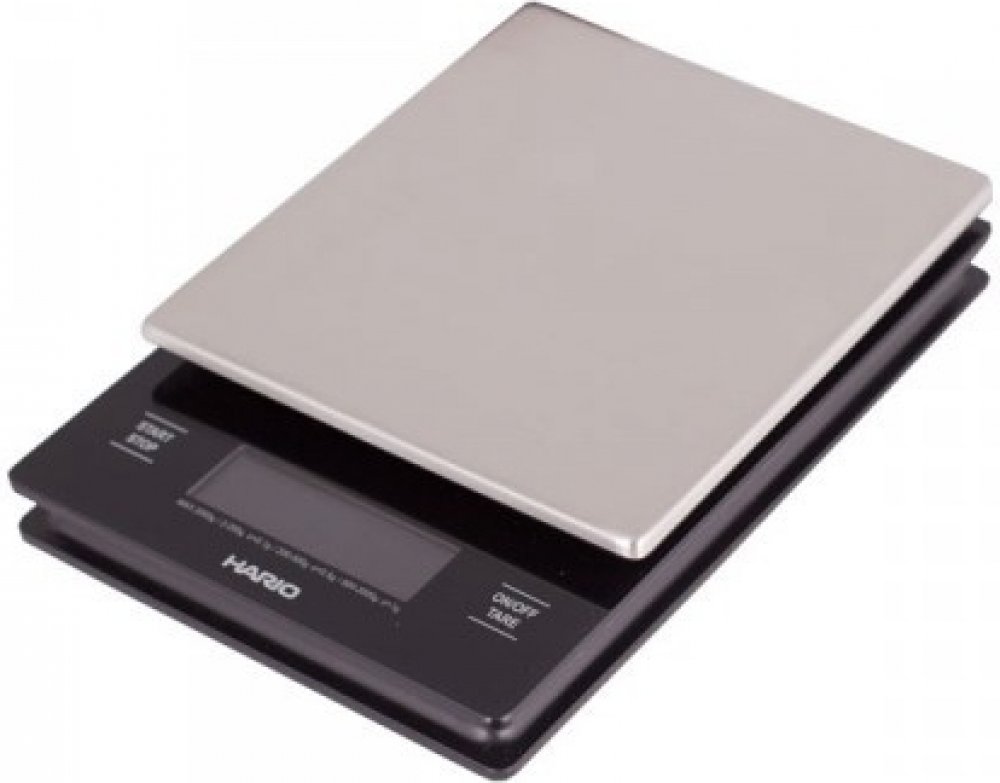 Nerezová váha od Japonské značky Hario. Má integrované stopky a přesnost měření na 0,1g.