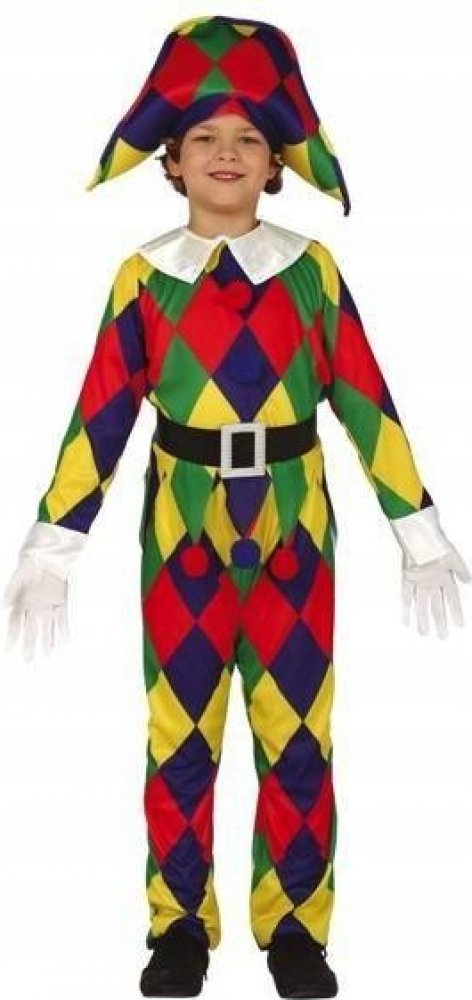Kostým je vyroben z materiálu s barevnými kosočtverci.