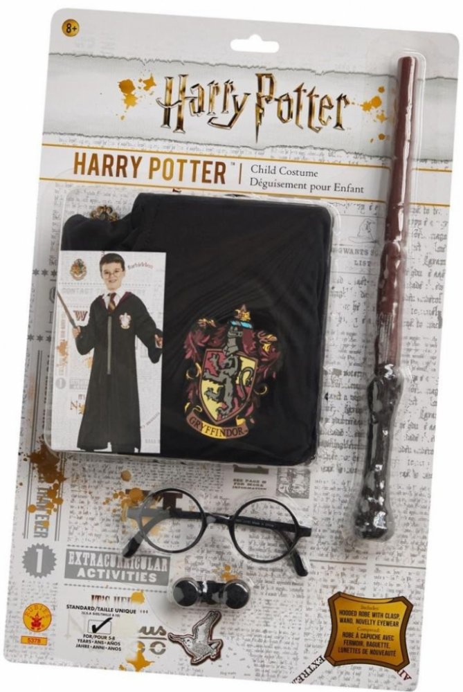 Školní uniforma, hůlka a brýle Harryho Pottera, kouzelníka z Bradavic.Harry Potter opouští svět Mudlů a vydává se do školy čar a kouzel - do slavných Bradavic. Bradavice nejsou jen kouzla a spousta tajemství, ale i přísný řád, který musí kouzelníci dodržovat.Toto balení obsahuje nejen uniformu Harryho Pottera, ale i slavnou hůlku a brýle bez kterých by to zkrátka nebyl Harry Potter takový jak ho známe.Uniforma je černé barvy, nechybí ani kapuce a logo představující kolej, do které Harry Potter patří. Univerzální:hrudník: 81 - 86 cmpas: 56 - 60 cmUPOZORNĚNÍ Nebezpečí udušení. Nevhodné pro děti mladší 36 měsíců. Obsahuje malé části, které by mohly být spolknuty nebo vdechnuty.Obal není hračka, před použitím hračky ho odstraňte z dosahu dítěte, může způsobit zadušení.