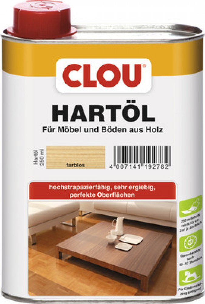 CLOU Hartöl zasychá tvrdý, nelepivý, hedvábně matný a vykazuje velmi dobré plnění. Dá se využít také k povrchové úpravě např. dětského nábytku a také podlah. Olej šetřuje a oživuje také už dříve olejované plochy. Povrch opatřený olejem Hartöl splňuje ustanovení normy DIN EN 71, díl 3 (migrace sledovaných částic), dále splňuje také požadavky normy DIN 53160 na odolnost slinám a potu a je vhodný na dětské hračky a dětský nábytek.