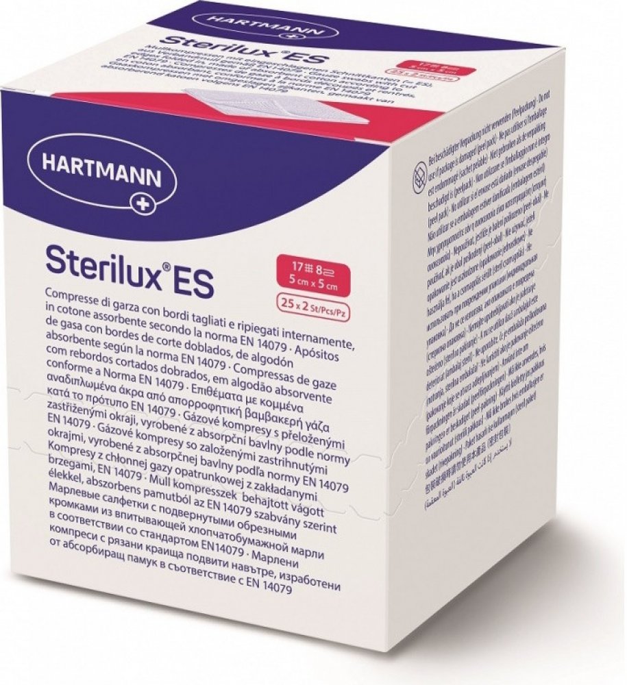 Kompresy Sterilux ES jsou krytí z obvazové gázy o 17 vláknech se založenými okraji. Jako klasický krycí obvazový materiál mají širokou oblast použití a pro ošetřování ran jsou nezbytné. Používají se k všestranné péči o rány, zejména při prvním ošetření znečištěných, infikovaných a silně secernujících ran; dále jako sekundární krycí materiál a jako tampony při malých operativních zákrocích v ambula...
