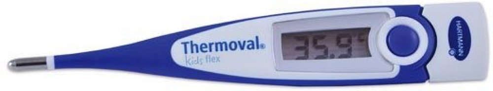 Dětský teploměr Thermoval kids flex změří tělesnou teplotu podle potřeby s přesnosti na desetinu stupně. Jeho paměť zobrazí před měřením poslední naměřenou hodnotu.