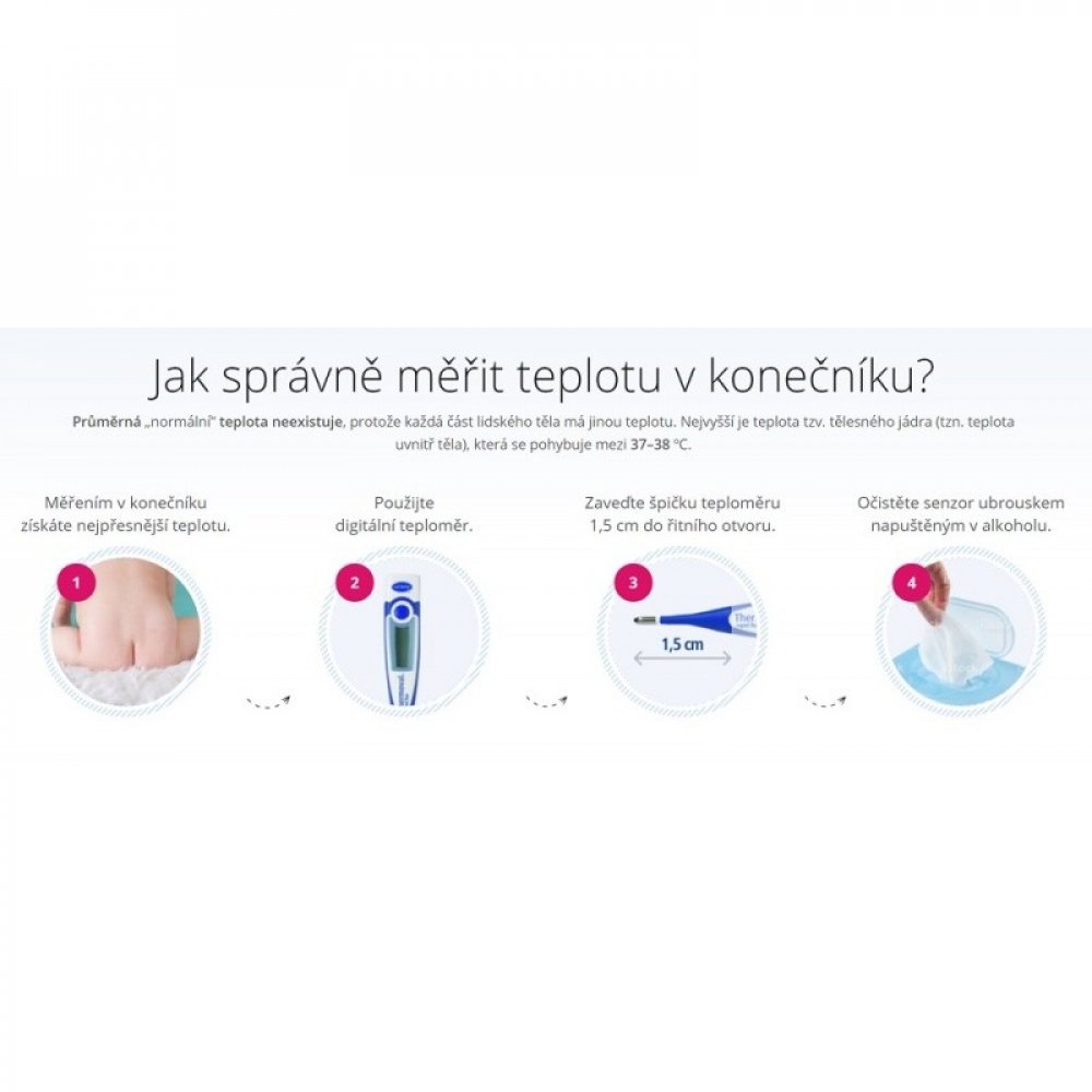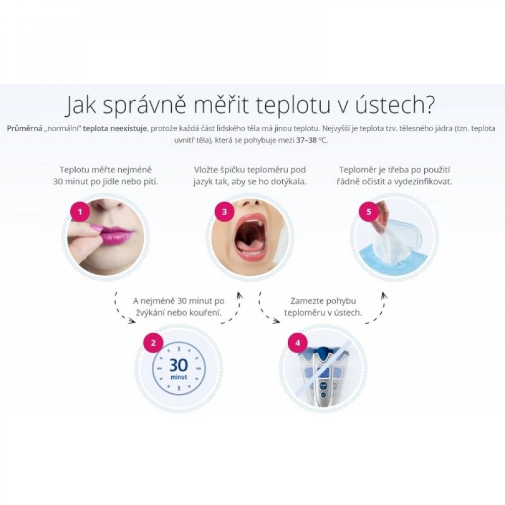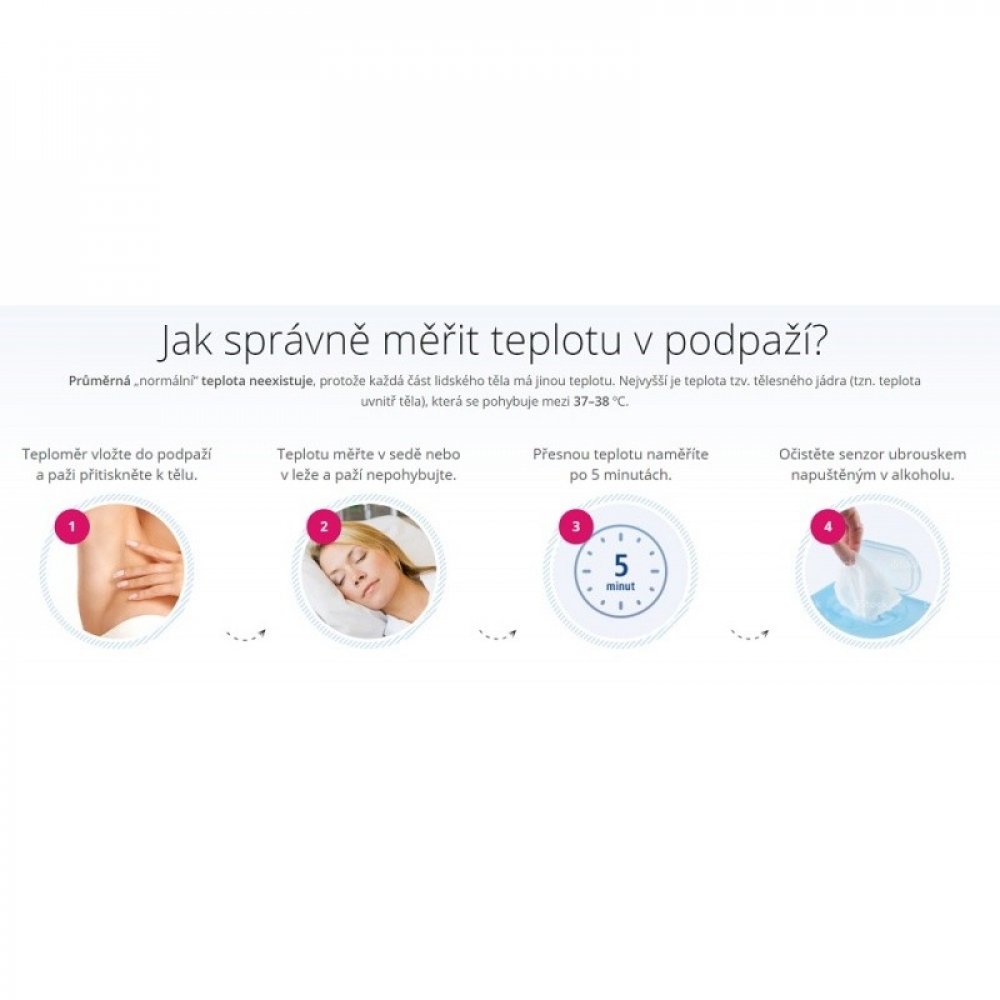 - Změřte teplotu v zadečku (40‐60 sekund), ústech (60 sekund) nebo v podpaží (60‐90 sekund). Pro přesné měření v podpaží doporučujeme měřit teplotu po dobu 5 minut.