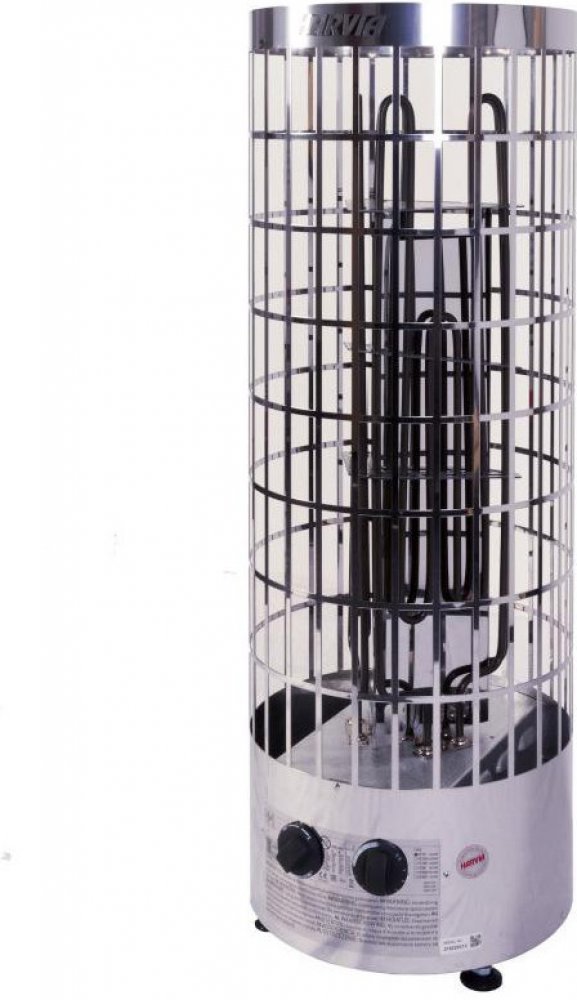 Saunová kamna Harvia Cilindro z nerez oceli. Časovač a termostat se ovládají otočnými knoflíky. U tohoto druhu topidla je nutné počítat s delší dobou oh...