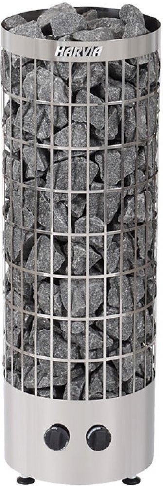 Saunová kamna Harvia Cilindro z nerez oceli. Časovač a termostat se ovládají otočnými knoflíky. U tohoto druhu topidla je nutné počítat s delší dobou ohřevu, které však zajišťuje vysokou akumulaci kamenů v topidle. To vám zaručí přírodní saunování bez častého dohřívání spirál.