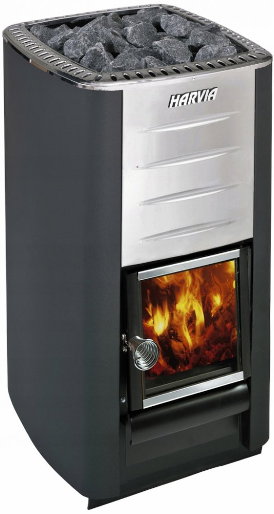 Kamna na dřevo jsou vybavena skleněnými dvířky, která dodávají nádech tradiční atmosféry finské sauny. Barva kamen je zvolena v elegantním černém grafitu. Přední plášť je vyroben z nerezu.