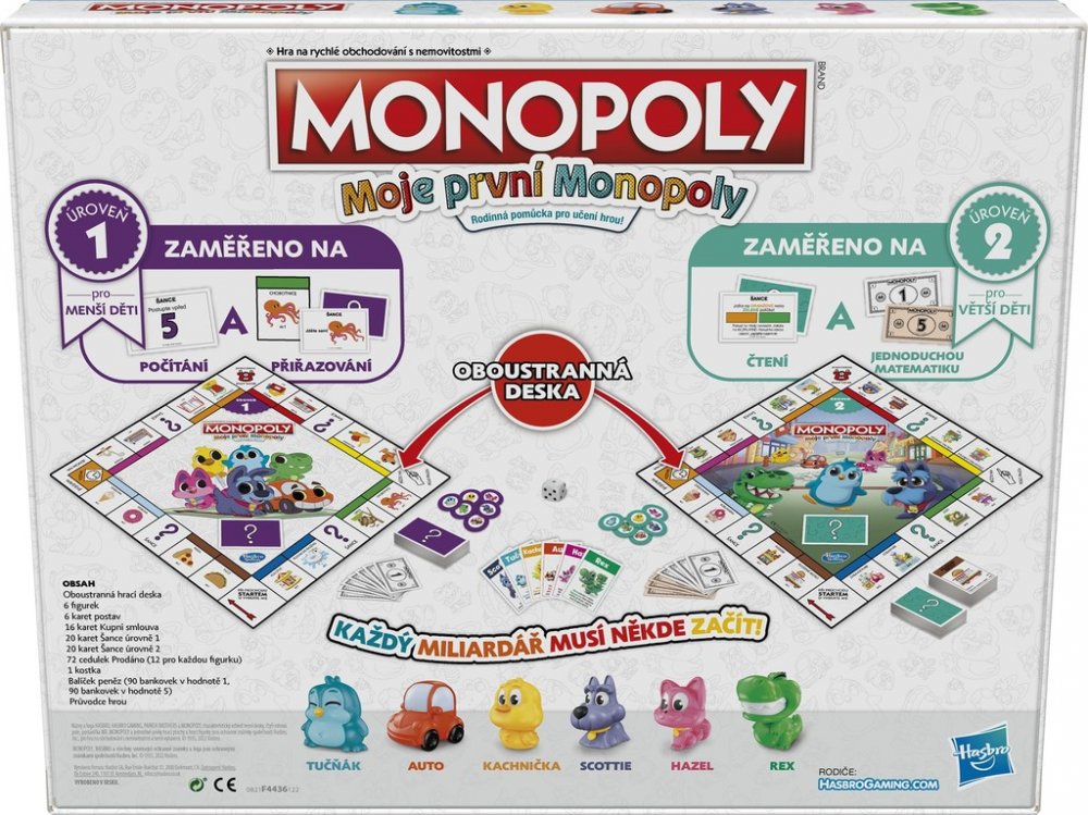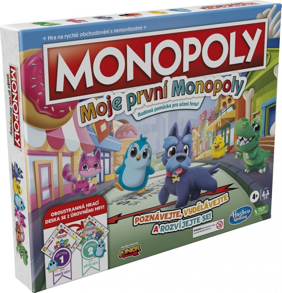 Zbrusu nová verze oblíbené stolní hry Monopoly nyní ve verzi vhodné pro děti již od 4 let.. Hra obsahuje oboustrannou herní desku díky které si děti i jejich rodiče mohou užít ještě více zábavy. Díky jednoduché hratelnosti a lokalitám vhodným pro děti je tato hra skvělým vstupem do hry Monopoly. jednoduchá hratelnost lokality vhodné pro děti oboustranná herní deska obsahuje verzi pro menší i větší děti Popis: Tato nová verze obsahuje oboustrannou hrací desku pro 2 způsoby hry! Díky jednoduché hratelnosti a lokalitám vhodným pro děti je tato hra skvělým vstupem do hry Monopoly. Hra, která roste s vašimi dětmi! Jedna strana je určena pro mladší děti (4+), a když ji otočíte, najdete pokročilejší hru pro starší předškoláky! Hra obsahuje sadu karet pro každou úroveň. Mladší děti mohou hrát s dolarovými bankovkami a starší děti mohou použít balíček pětidolarovek. Hra obsahuje žetony inspirované klasikou a představuje 2 nové žetony.