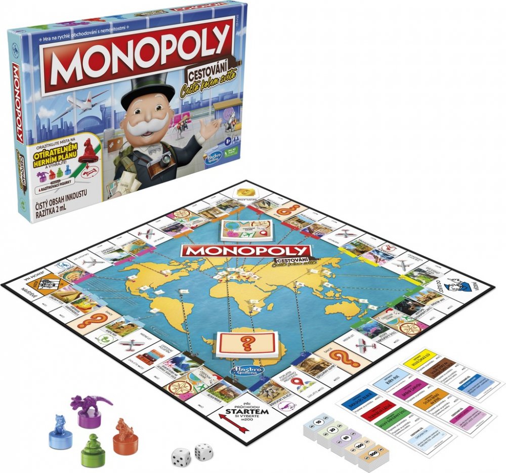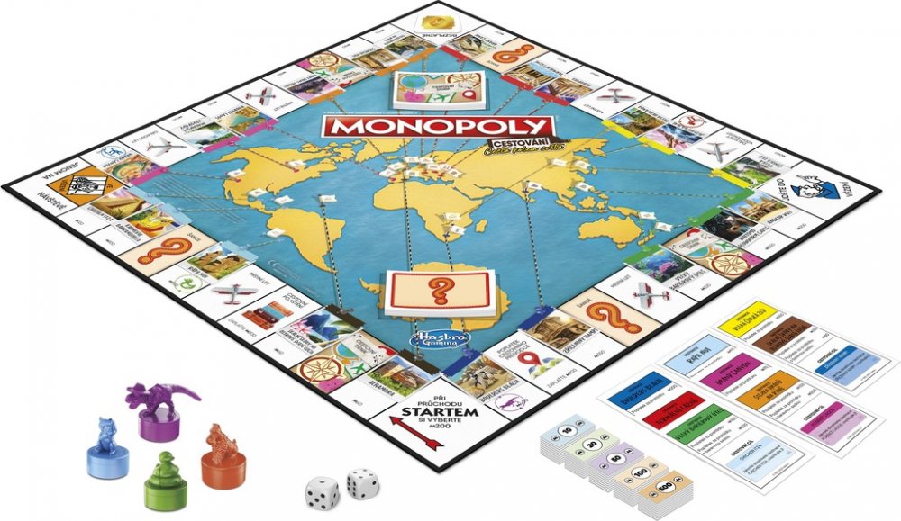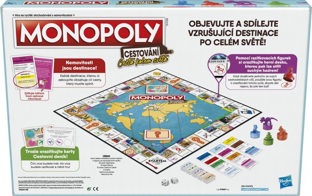 Vydejte se na vzrušující cestu kolem světa s cestovatelskou edicí oblíbené hry Monopoly. Navštivte různé destinace světa, plňte cestovatelské úkoly a sbírejte razítka. Cestováním po hracím plánu se navíc dozvíte i zajímavé informace o destinacích.