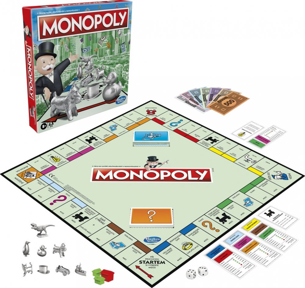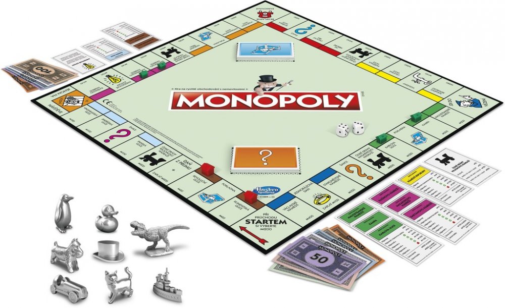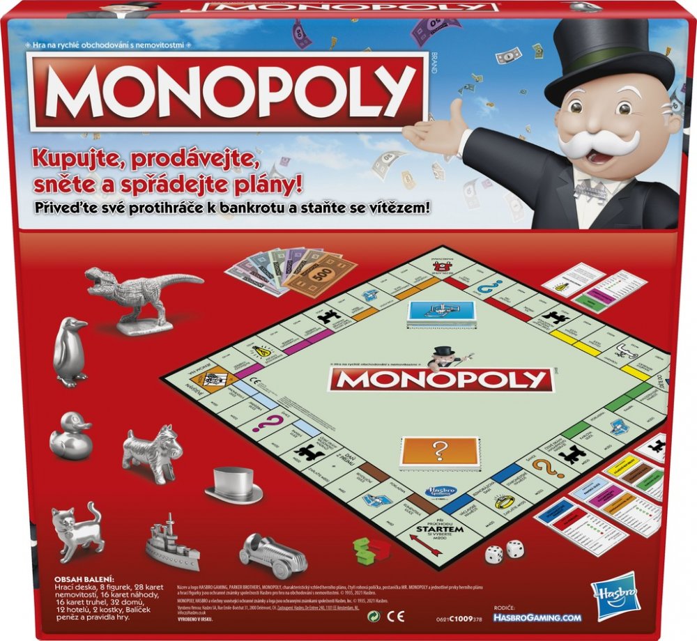 Obsah balení: herní plán, 8 figurek, 28 karet Kupní smlouva, 16 karet Šance a Pokladna, 32 zelených domů, 12 červených hotelů, 2 kostky, balíček peněz a návod ke hře