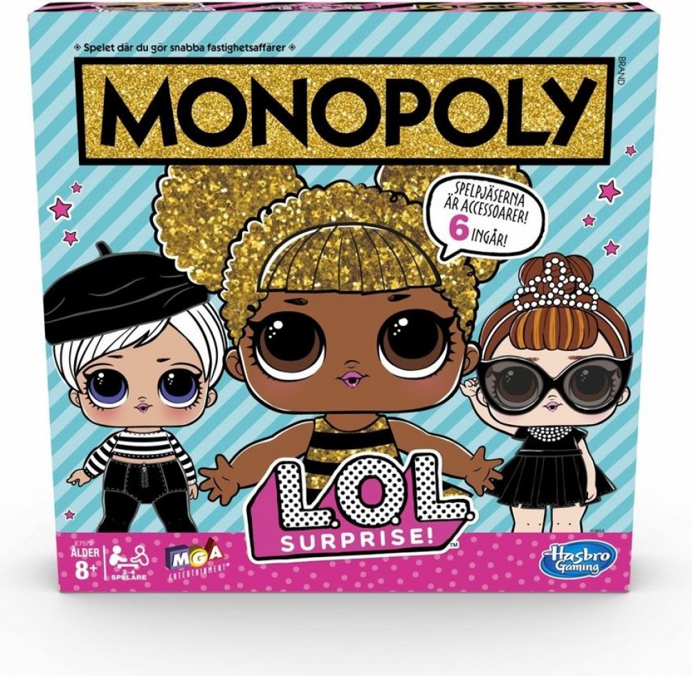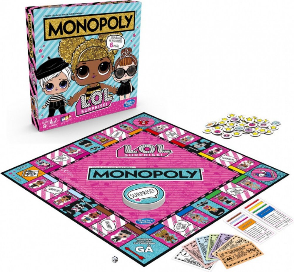 Společenská hra pro 2–4 hráče, doporučený věk od 8 let, alespoň na 45 min hraní, pro holky, anglická verze Oblíbená hra Monopoly tentokrát inspirovaná populárními panenkami LoL Suprise. Hra přináší oproti klasické hře Monopoly řadu novinek. Kupujte, prodávejte a vyměňujte si se svými spoluhráči roztomilé panenky. Místo domů a hotelů máte k dispozici hvězdy a emoji.