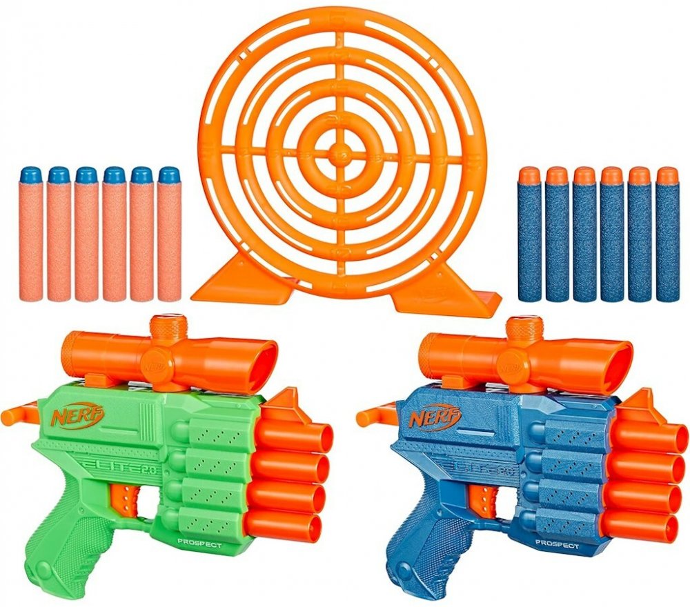 Prospect QS-4, terč a šipky Nerf Elite Zasáhněte cíl a získejte body v soutěžních výzvách. Vložte 4 šipky, stáhněte dolů zapalovací rukojeť a stiskněte spoušť pro vypuštění 1 šipky. Každý blaster vystřelí 4 šipky v řadě, má zaměřovací dalekohled pro míření, zatahovací rukojeť a obsahuje 4 šipky Nerf Elite. Doporučený věk 8+