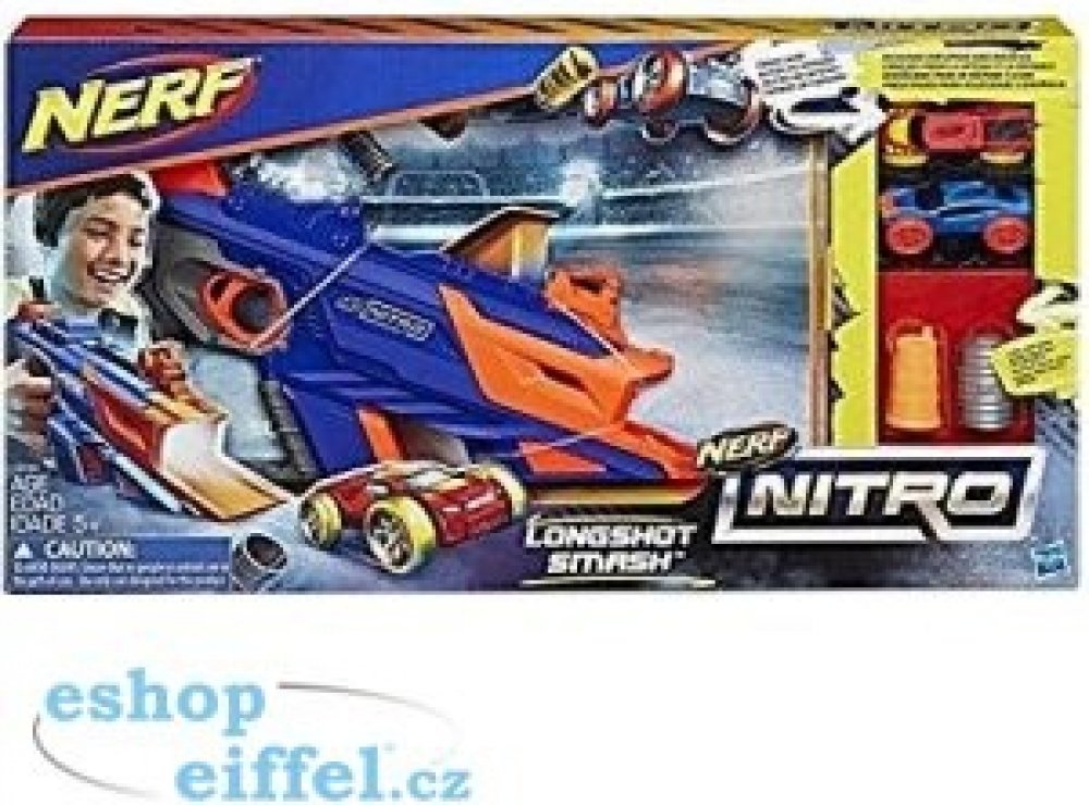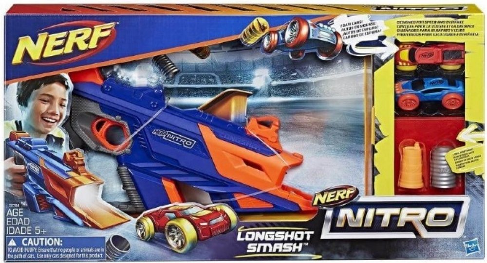 Užij si nevšední zábavu s Nerf Nitro blasterem Longshot Smash! Blaster je v balení dodáván se 4 překážkami, které si můžeš nastavit podle sebe a sestavit si tak super dráhu. Střílej pěnová autíčka na rampu a vytvářej tak nejšílenější kaskadérské akce! V balení je blaster, 4 překážky, rampa a 2 pěnová autíčka.