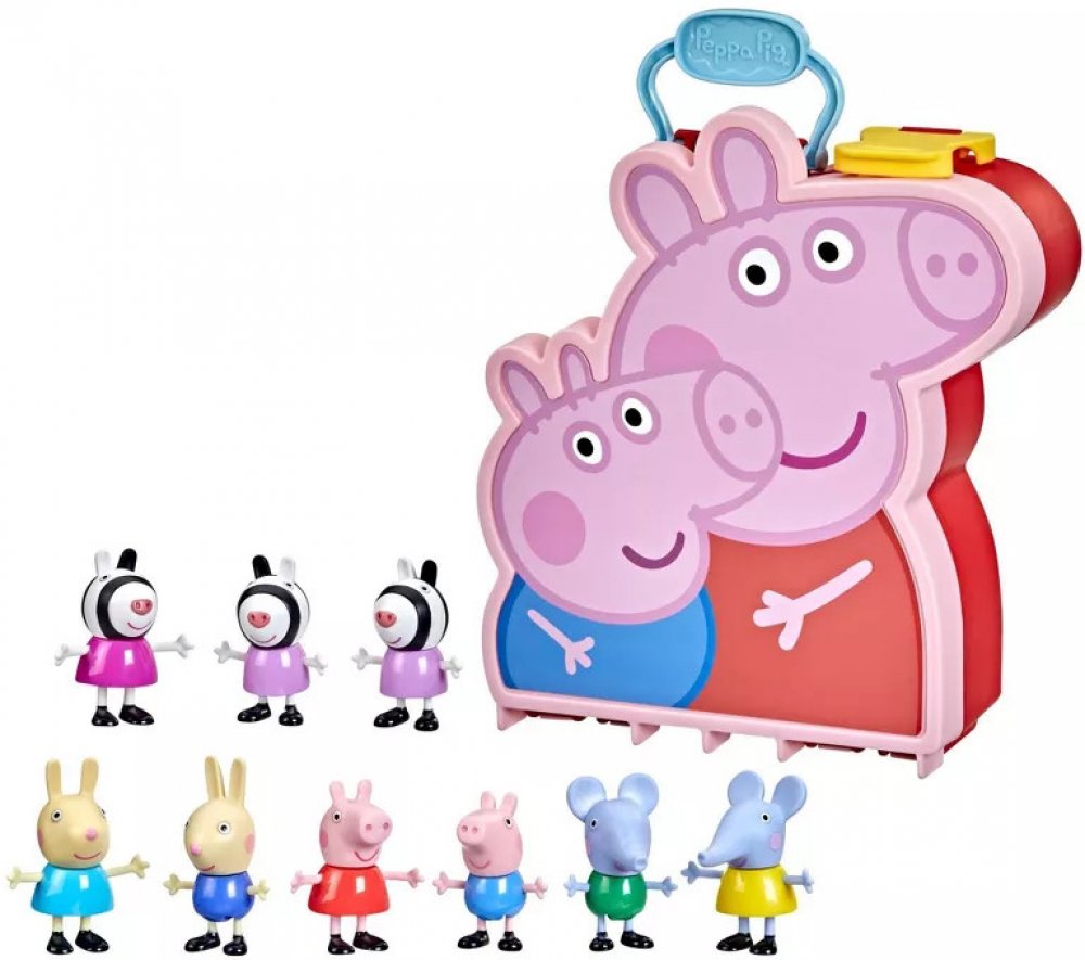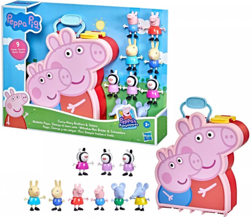 Peppa Pig Take Along Box Bratři a sestry Skvělá sourozenecká zábava! Obsahuje 9 figurek inspirovaných seriálem Prasátko Peppa v praktickém boxu s Peppou a Georgem. Sada obsahuje figurky zebry Zoë a dvojčat zebry Susi a Siny! Součástí jsou také lžička Luisa a lžička Linus, stejně jako slonice Emily a slon Edmund Děti mohou vytvářet vzrušující scény na hraní s hracími sadami Zábavné ruské kolo a Peppino zmrzlinářské auto (prodávají se samostatně, podle dostupnosti) Doporučený věk: od 3 let Popis produktuS boxem Bratři a sestry mohou děti od 3 let prožívat vzrušující dobrodružství s prasátkem Peppou, jejím bratrem Schorschem a některými jejich kamarády, jako jsou sourozenci Luisa a Linus Löffelovi nebo Emily a Edmund Elefantovi. Sada obsahuje také exkluzivní figurky sourozenců Zebrových: Zoë Zebra a dvojčata Susi a Sina. Všech 9 figurek se pohodlně vejde do krabičky na přenášení s Peppou a Georgem a je v ní místo pro další figurky!