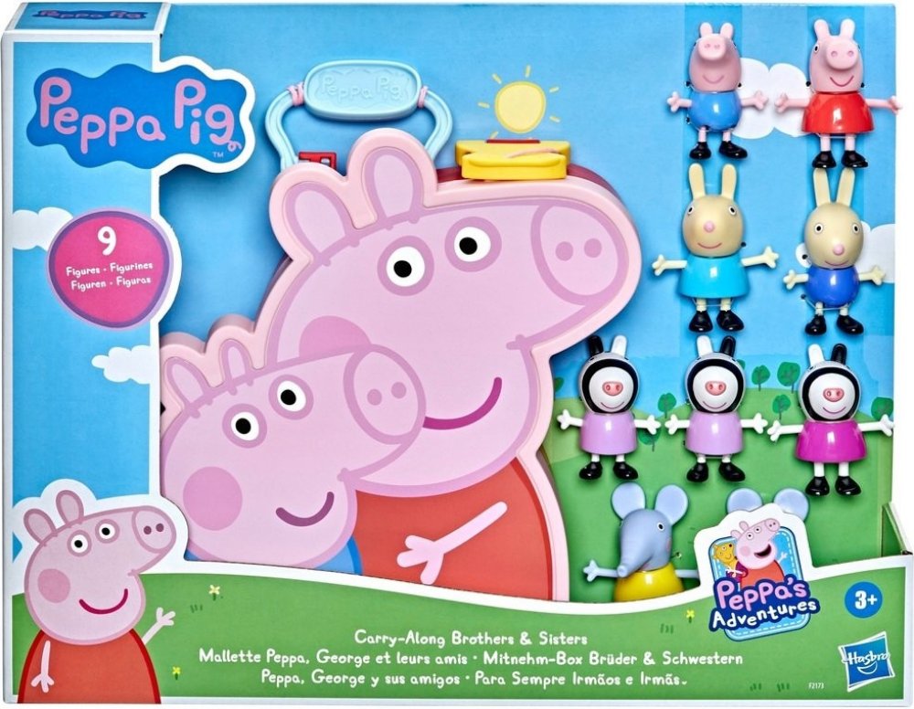 Peppa Pig Take Along Box Bratři a sestry Skvělá sourozenecká zábava! Obsahuje 9 figurek inspirovaných seriálem Prasátko Peppa v praktickém boxu s Peppou a Georgem. Sada obsahuje figurky zebry Zoë a dvojčat zebry Susi a Siny! Součástí jsou také lžička Luisa a lžička Linus, stejně jako slonice Emily a slon Edmund Děti mohou vytvářet vzrušující scény na hraní s hracími sadami Zábavné ruské kolo a Pep...