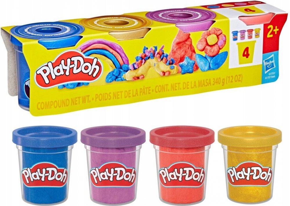 Doplňte svou sbírku kelímků Play-Doh barevnou metalickou sadou a vytvářejte nejrůznější stavby, podle libosti. Pamatujte, že jediným omezením je vaše představivost. Play-Doh metalická sada je perfektní volbou pro kreativní děti, které chtějí svým výtvorům dodat slavnostní nádech. Sada Play-Doh obsahuje 4 barvy. Díky zářivým barvám – modré, žluté, fialové a červené –inspiruje k nápaditým mistrovským dílům. Každý kelímek obsahuje 85 g modelovací hmoty Play-Doh s částečkami slídy, pro okouzlující zážitek s bohatou texturou.
