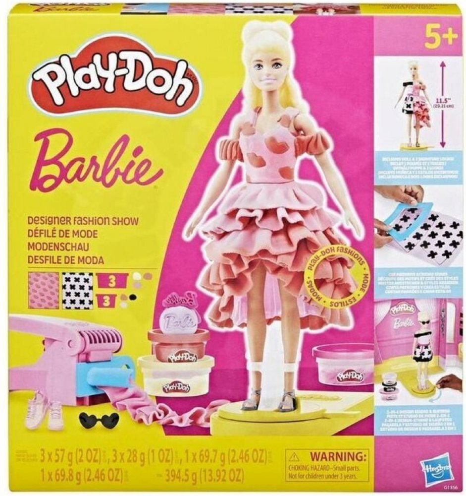 Vytvořte super roztomilé styly se sadou Play-Doh Barbie pro panenky. S touto kreativní sadou je výroba oblečení pro panenku Barbie jednoduchá a zábavná. Jednoduše umístěte panenku na stojan, použijte vzorkovník a formičky Play-Doh na vystřihnutí šatů pro Barbie a oblečte ji těmi nejnápaditějšími způsoby. Vytvořte panence dva různé účesy z Play-Doh s formičkami na krátké a dlouhé vlasy nebo si vytv...