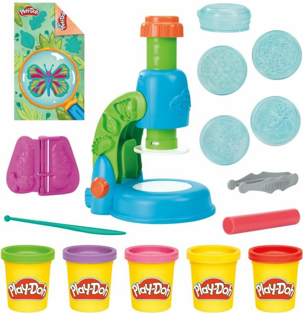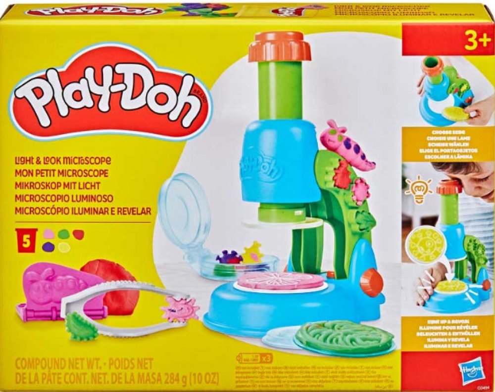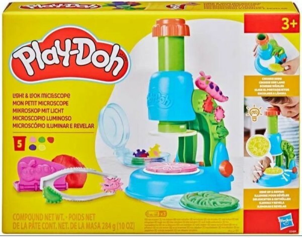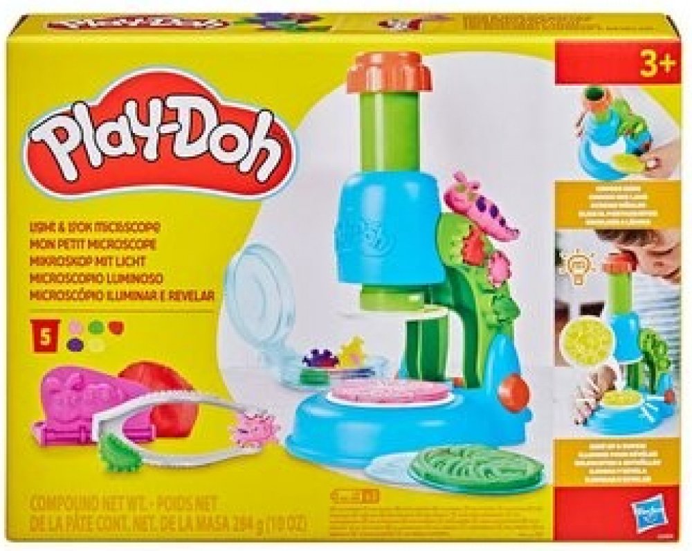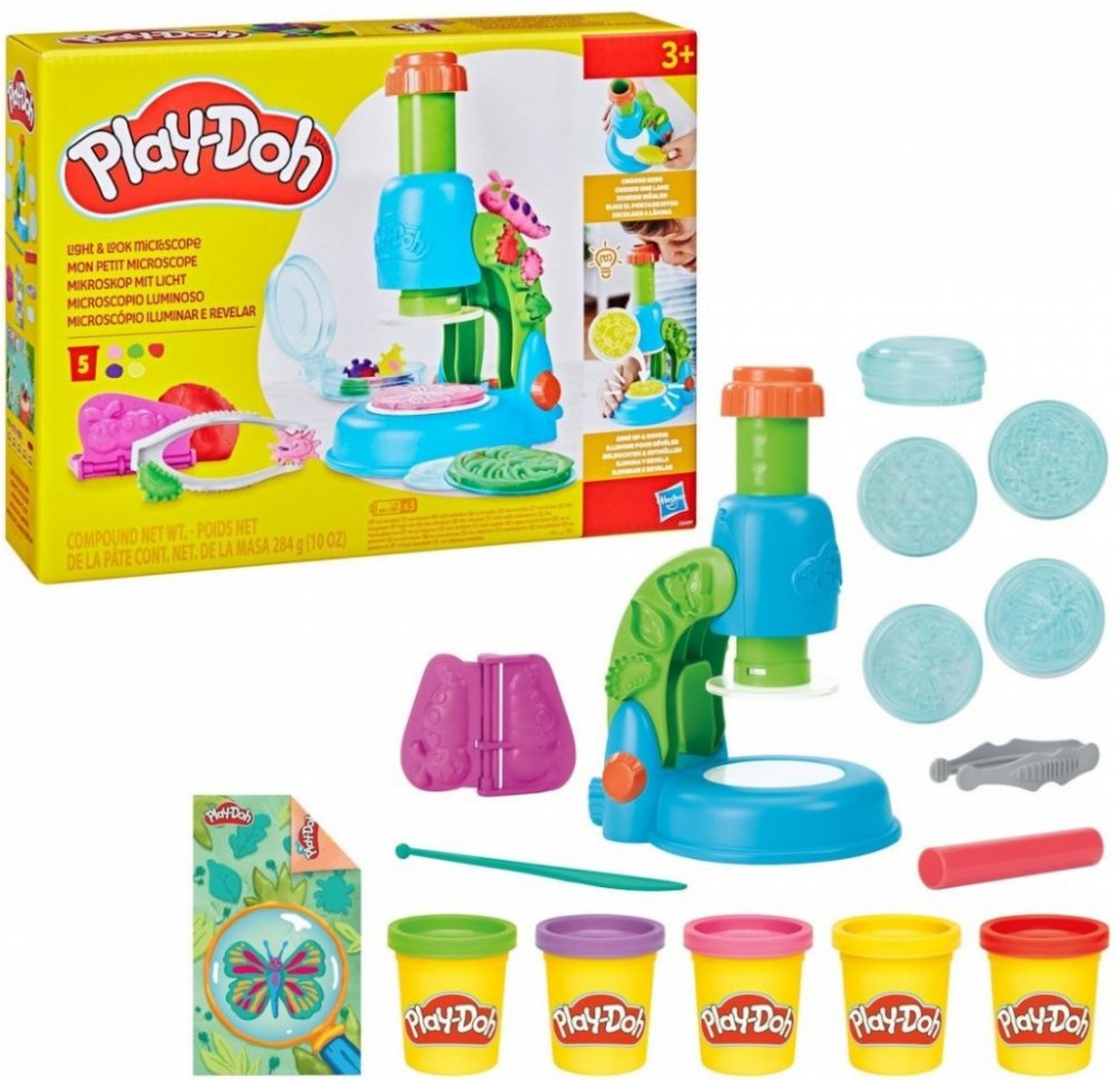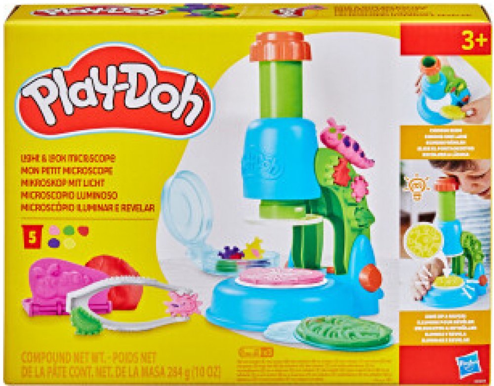 Se sadou Play-Doh Mikroskop se rozzáří dětská zvídavost a představivost. Hračka se svítícím mikroskopem dodá zářivý efekt výtvorům z modelíny Play-Doh, které mohou děti vytvářet na 4 průhledných sklíčkách. Stačí vybrat sklíčko, vyplnit ho modelínou a stisknutím dalekohledu dolů výtvor vyrazit a aktivovat světlo. Vytvořte barevné rostliny, brouky a mikroorganismy a zkoumejte je v Petriho misce.