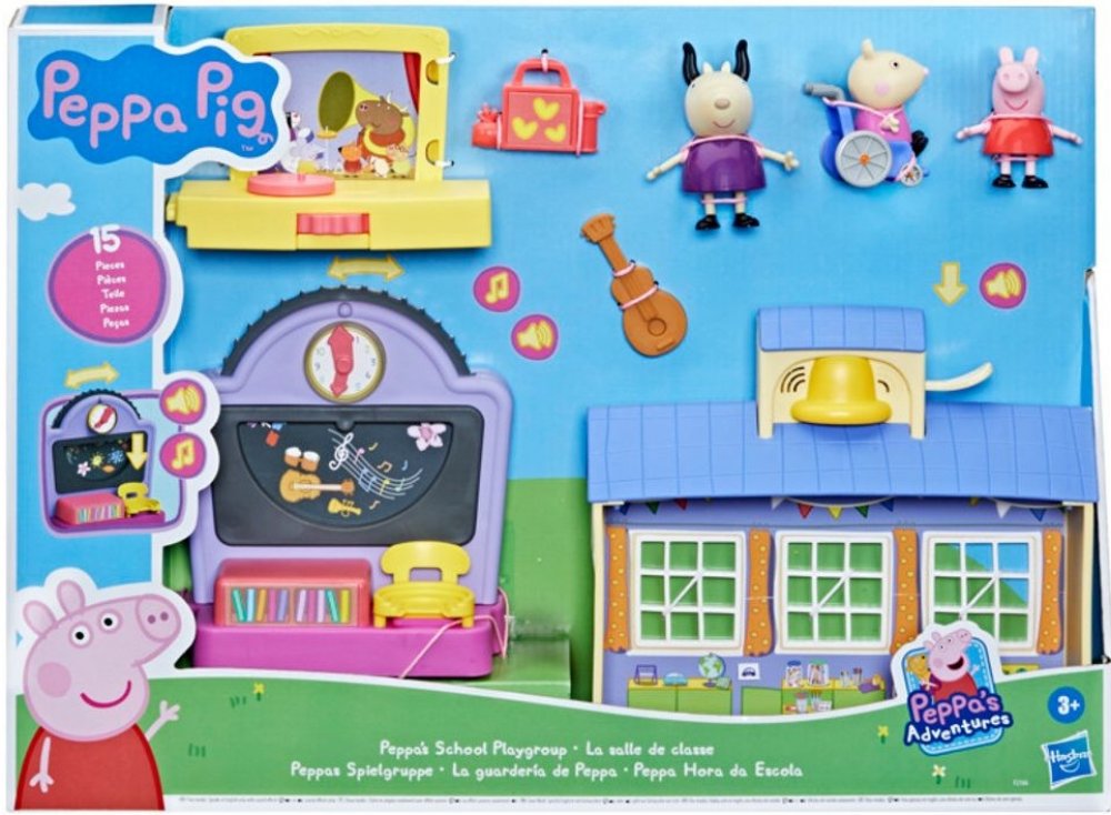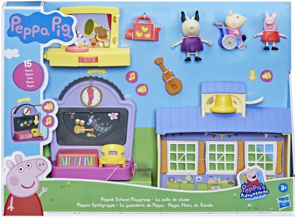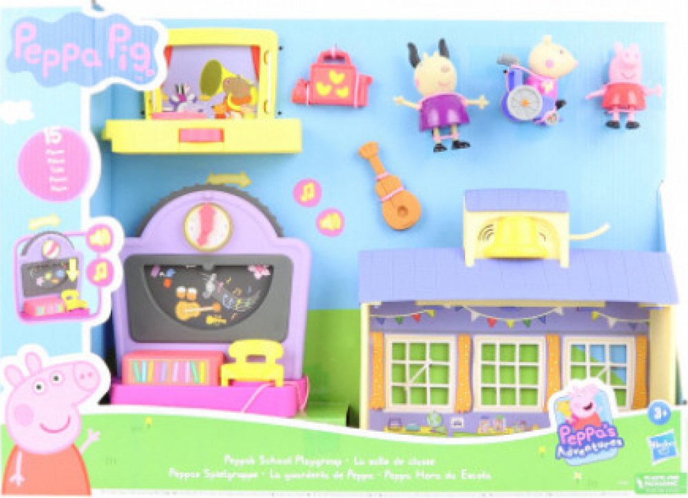 V této nové herní sadě si děti užijí předměty hudební a výtvarné výchovy, vyprávění příběhů a mnoho dalšího v Peppině školní třídě doprovázené povídáním madam Gazely a dalšími zvuky, které znáte ze seriálu.