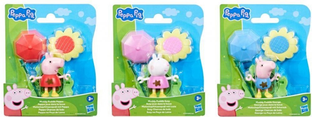 Prasátko Peppa zábava v louži – figurka s doplňky. Děti si mohou přehrávat scény ze seriálu nebo vymýšlet nová vlastní dobrodružství s figurkou Peppa pig zábava v louži. Tato sada je úžasnou hračkou pro děti, které milují tento seriál. Kolekce 3 druhů – Peppa, George a Suzy. Každé balení obsahuje figurku, stojánek, slunečník a deštník. Rozměry balení: 15,1 x 12,7 x 3,8 cm. Věk: 3+