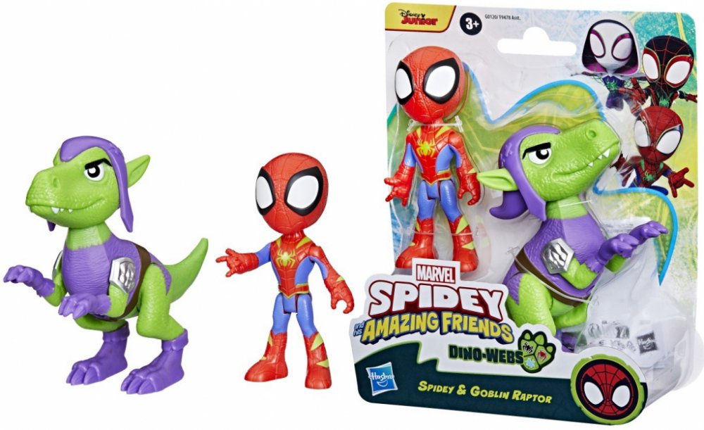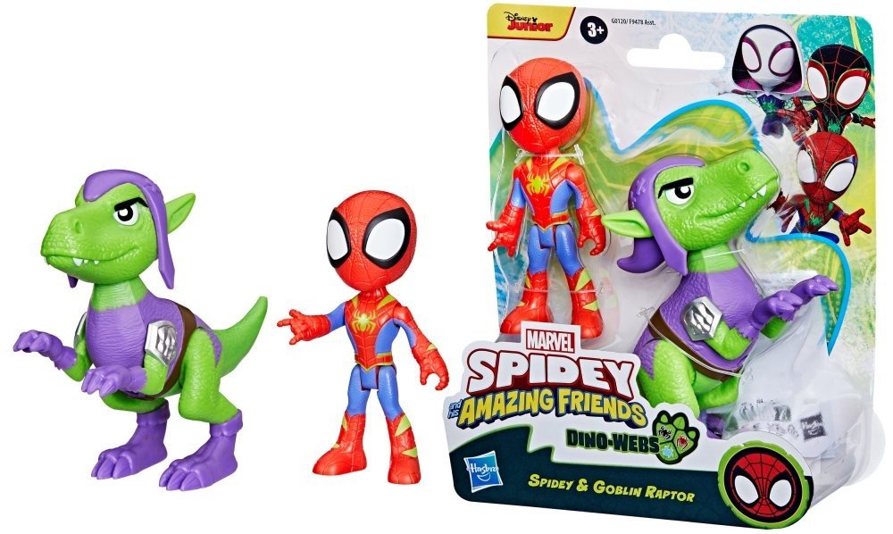 Spider-man Spidey a jeho přátelé Dino-Webs. Vydejte se na dobrodružnou cestu s akčními figurkami Marvel Spidey a jeho úžasnými přáteli – Spidey a Goblin Raptor! Tato sada figurek obsahuje polohovatelnou 10 cm figurku Spideyho, která má na sobě kostým s dinosauřími prvky a polohovatelnou figurku záporáka Goblin Raptora. Rozměr balení: 17,5 x 15 x 6,5 cm. Věk: 3+
