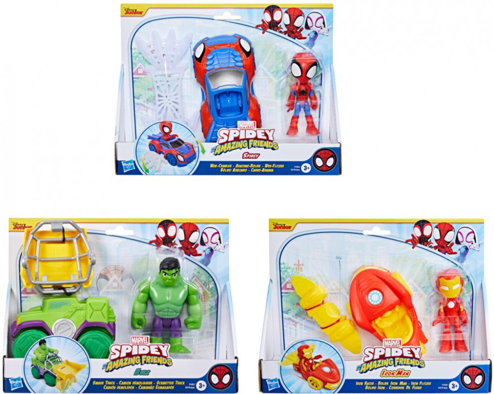 Tyto sady obsahují 10centimetrovou akční figurku, vozidlo a příslušenství, takže děti se mohou vrhnout do akce a pomoci Spideyho týmu zničit padouchy!