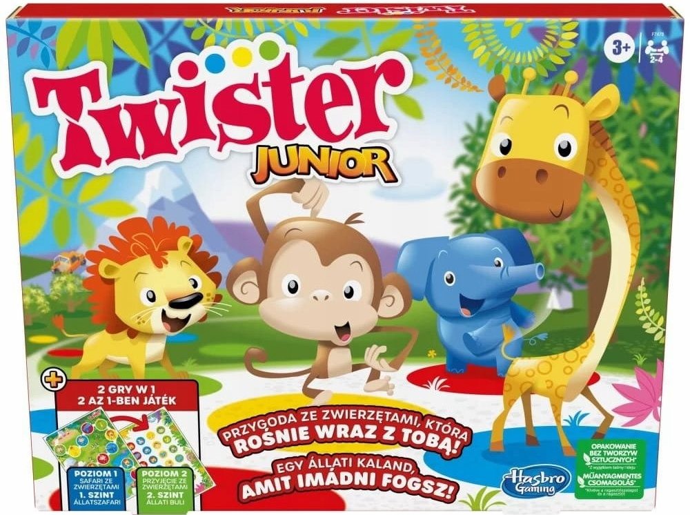 Twister je pohybová hra, v níž je třeba udržet se na nohou. Twister Junior přichází s rostoucí variantou pro malé neposedy - obsahuje oboustrannou podložku, která nabízí jednak safari stezku pro menší hráče a na druhé straně zvířecí párty, která již připomíná klasický twister. Při pohybu po safari stezce mají malé děti příležitost objevit barvy a zopakovat si zvuky a pohyby zvířat. Při hraní zvíře...