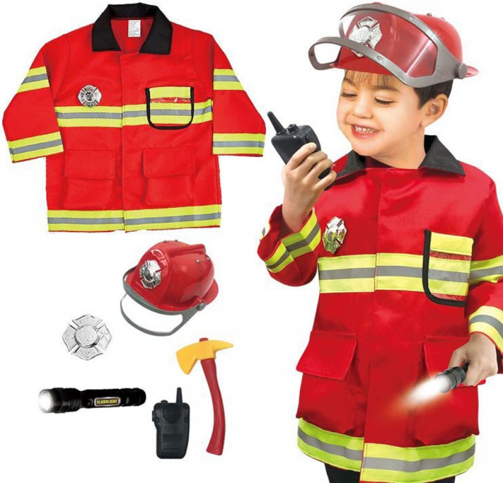 Kostým hasiče s doplňky. Set obsahuje helmu, vestu, sekerku, baterku a vysílačku. Baterka opravdu svítí! Kostým je vhodný pro děti od 3 do 8 let.
