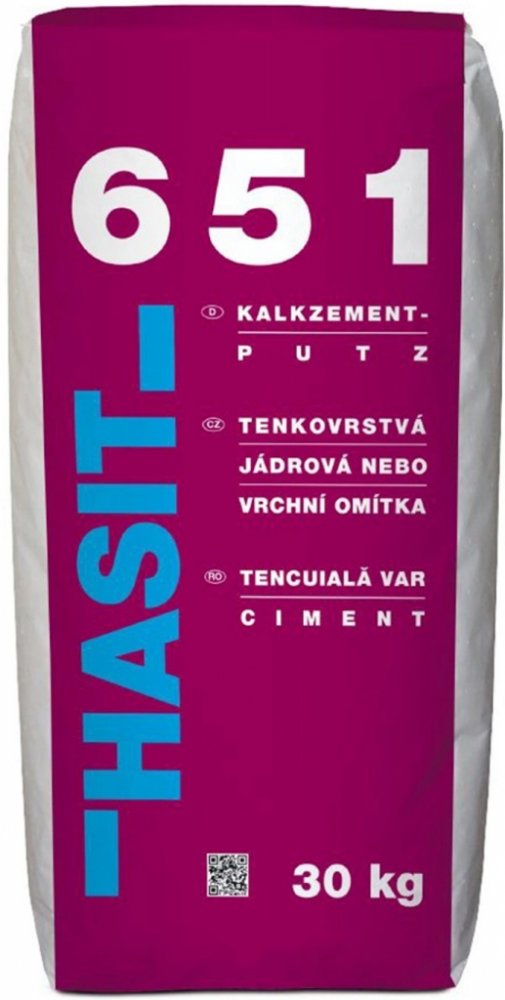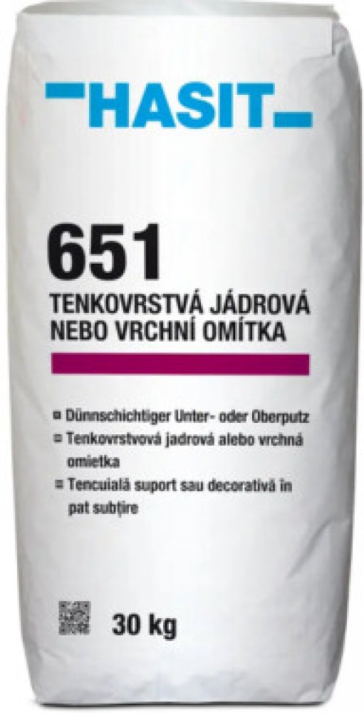 Tenkovrstvá jádrová nebo vrchní omítka HASIT 651 je určena pro vnitřní i vnější použití. Vhodná pro strojní i ruční omítání stavebních materiálů vyráběných pro přesné zdění (např. YTONG apod.). Maximální tloušťka jedné vrstvy je 10 mm. Vhodná také jako jádrová omítka k ochraně pórobetonových tvárnic ve vnitřním prostředí s vloženou výztužnou tkaninou odolnou vůči alkáliím, tenkovrstvá omítka pro povrchovou úpravu betonových ploch (stěn, stropů) a lze použít na pórobeton a jako vrchní omítka s povrchovou úpravou filcováním. Nepoužívat na zdivo zasažené vlhkostí a solemi.