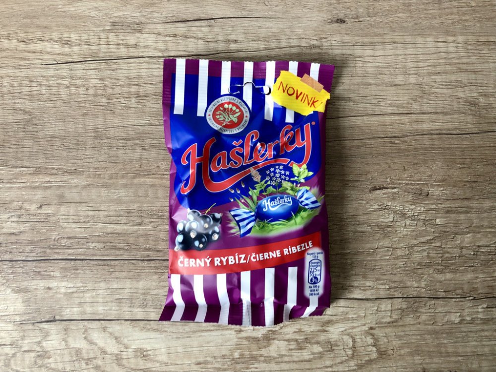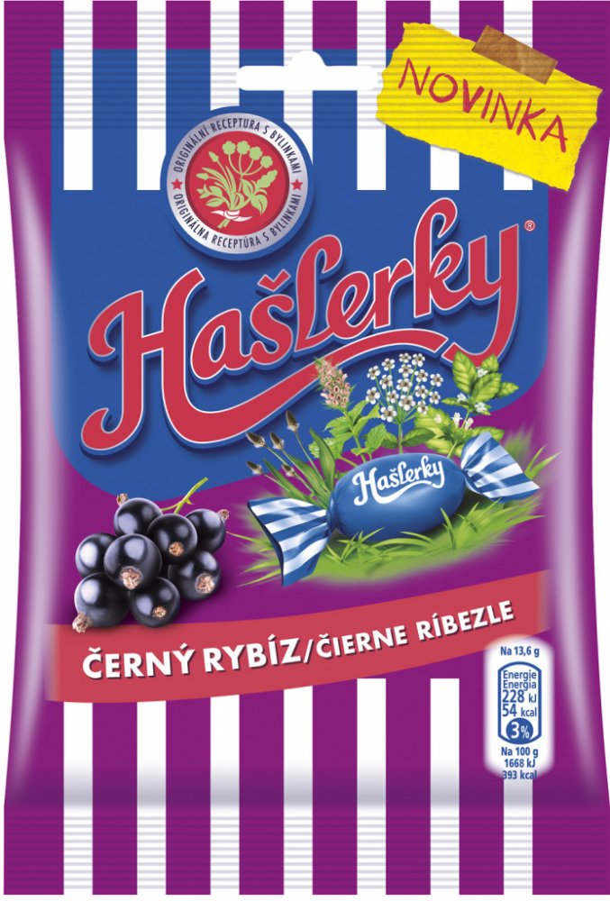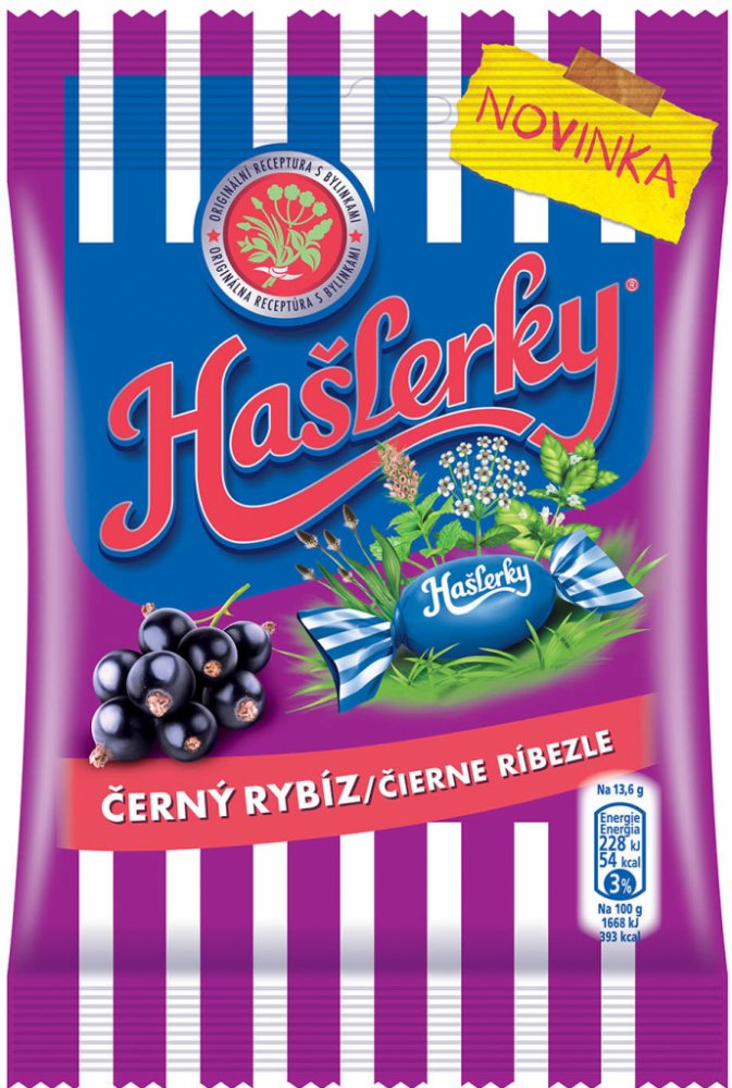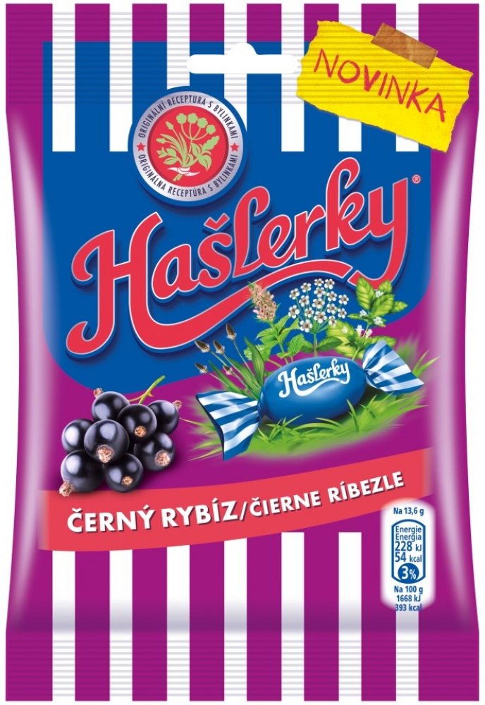 Cukr, glukózový sirup, černorybízová šťáva z koncentrátu 1,7 %, kyselina (kyselina citronová), aromata (černý rybíz, mentol, anetol), anýzový olej 0,03 %, rostlinné extrakty 0,02 %, (meduňka, jitrocel), barvivo (rostlinná uhlíková čerň)
