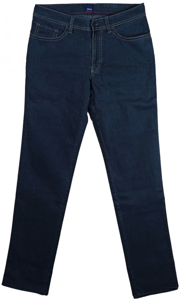 Pánské tmavě modré džíny hattric se zapínáním na zip. Značkové džíny jsou klasického střihu s rovnou nohavicí dole. Mají dvě přední a dvě zadní klasické prostorné kapsy a jednu malou kapsičku, které je součástí pravé přední kapsy. Kožená cedulka se značkou je našita na zadní straně kalhot.