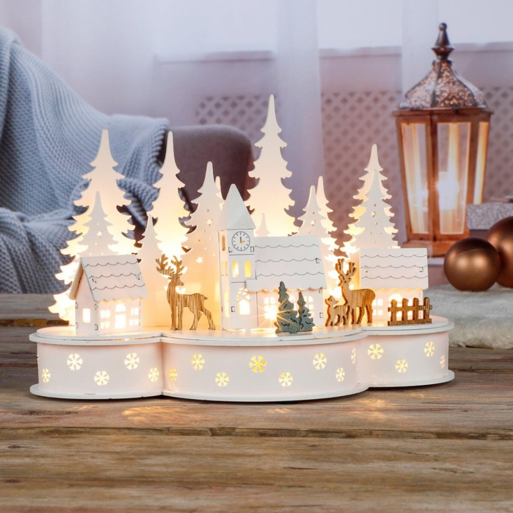 Osvětlená zasněžená vesnička s radnicí s věžními hodinami a vším, co k bílým Vánocům patří, vytváří kouzlo útulného domova. 10 LED diod zajišťuje příjemné osvětlení.