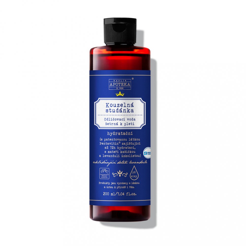 Vysoce hydratační odličovací voda pro suchou a šupinatou pleť pro pleť vysušenou sluníčkem osvěžující voda s levandulovou vůní čistí pleť do hloubky odlíčí make-up, odstraní prach a nečistoty obsahuje levanduli úzkolistou, mateří kašičku, vitamín E a Pentavitin® pro svěží a čistou pleť Aplikace: Odličovací voda Kouzelná studánka je určena pro každodenní použití nejlépe 2 krát denně (ráno a večer) nebo dle potřeby. Návod na použití micelární vody: Naneste odličovací vodu na vatový tamponek a tím očistěte pleť, krk a oční okolí a jemně setřeme nečistoty. Opakujeme případně několikrát, dokud není poslední tamponek po očištění celého obličeje čistý. Opláchněte poté pokožku čistou vodou, nejlépe studenou, jelikož uzavírá póry po čištění pleti. Vhodné pro: Odličovací voda Kouzelná studánka je vhodná zejména pro suchou, šupinatou, dehydrovanou pokožku. Obsah účinných a výživných látek: Levandule úzkolistou, mateří kašičku, vitamín E a Pentavitin® ... Prohlášení Havlíkovy přírodní apotéky k nové koncentraci produktu: "Prohlášení Kouzelná studánka. Odličovací voda Kouzelná studánka byla doposud čirá. Vzhledem k úpravě v receptuře může být nyní mléčně zakalená. Do receptury byl přidán vitamin E. Zákal nemusí být patrný, vzhledem k tmavé lahvičce, nicméně i tato možnost tady je. Poslední šarží, která je čirá, je 7-12-2019." Popis produktu: Vysoce hydratační odličovací voda Kouzelná studánka od Havlíkovy apotéky čistí dokonale pleť, krk i oční okolí od make-upu, prachu i nečistot, které se za celý den či noc na obličeji usadily. Je velmi šetrná a jemná k pleti. Díky hydratačním složkám je vhodná na suchou, žíznivou, šupinatou nebo dehydrovanou pokožku. Je vhodná i na pokožku vysušenou od sluníčka. Pokožku krásně vyčistí a zároveň osvěží a hydratuje. Má jemnou levandulovou vůni. Obsahuje levanduli úzkolistou, mateří kašičku, vitamín E a Pentavitin®. Mateří kašička vyživuje tkáň a pleť a podporuje buněčnou regeneraci. Levandule je pak známá pro své zklidňující, osvěžující účinky, uvolňuje napětí a stres. Má protizánětlivé účinky. Vítamín E se podílí na stabilitě buněčných membrán a chrání buňky před oxidačním stresem. Pentavitin® umí stimulovat klíčové geny kožní bariery. Díky tomu udržuje hloubkovou hydrataci (až 72 hodin), posiluje její bariérové funkce a zjemňuje tak povrch pokožky. Doplňte svou kompletní péči od Havlíkovy apotéky o odličovací vodu, která na trhu dlouho chyběla. Důležité: Odličovací voda od Havlíkovy apotéky není testovaná na zvířatech. Skladujte ji ve stinném místě do 25 stupňů. Ingredience: Aqua (demineralizovaná voda), Propanediol (hydratační látka z kukuřice), Saccharide Isomerate (Pentavitin®), Caprylyl/Capryl Glucosid (jemná čistící složka rostlinného původu), Disodium Cocoyl Glutamate (jemná mycí složka), Benzyl Alcohol (konzervant pro potraviny a certifikovanou přírodní a bio kosmetiku), Sodium Lactate (hydratační složka), Royal Jelly Extract (mateří kašička), Tocopherol (vitamin E, antioxidant), Citric Acid (kyselina citronová, slouží k úpravě finálního pH), Sodium Citrate (citrát sodný, slouží k úpravě finálního pH), Lavandula Angustifolia Oil (esenciální olej z levandule úzkolisté).