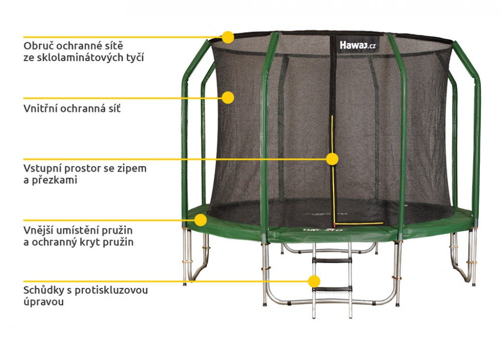 Sami si trampolíny na zahraničním trhu vybíráme, testujeme i dovážíme. To jde ruku v ruce s kvalitou a bezva cenou. Kvalitu našich trampolín máme ověřenou už více než 12 letým prodejem s minimálním počtem reklamací. Trampolína Hawaj 366 cm poskytuje díky vnitřní síti skvělou ochranu a vaše děti i vás udrží v bezpečné vzdálenosti od okraje.
