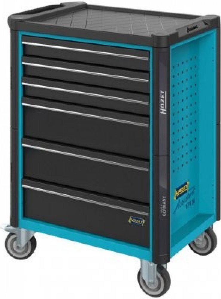 Provedení: Stabilní konstrukce z ocelového plechu, zásuvky s vodicími lištami s kuličkovými ložisky, úplným výsuvem, jednotlivé blokování proti nežádoucímu otevření během přesunu, s automatickým zavíráním. Základní výbava obsahuje dělicí plech pro každou zásuvku. Boční stěny mají čtvercové děrování, namontované díly budou chráněny před poškozením zataženými a v rámci rozměrů vozíku namontovanými bočními stěnami. Centrálně uzamykatelný pomocí cylindrického zámku. Se dvěma velkými kolečky uloženými na kuličkových ložiskách pro vysoká zatížení (O 125 mm), 2 otočné kolečky(O 125 mm) na jedné straně s brzdami koleček (úplné zastavení) pro stabilitu ve všech směrech. Všechna kola jsou vybavena ochranou ložiska, která ložiska chrání před nečistotami a nitěmi. Svislá průběžná ochrana hran na všech čtyřech stranách vozidla. Povrch odolný proti poškrábání, práškové lakování, korpus v modré barvě Hazet, zásuvky černé.