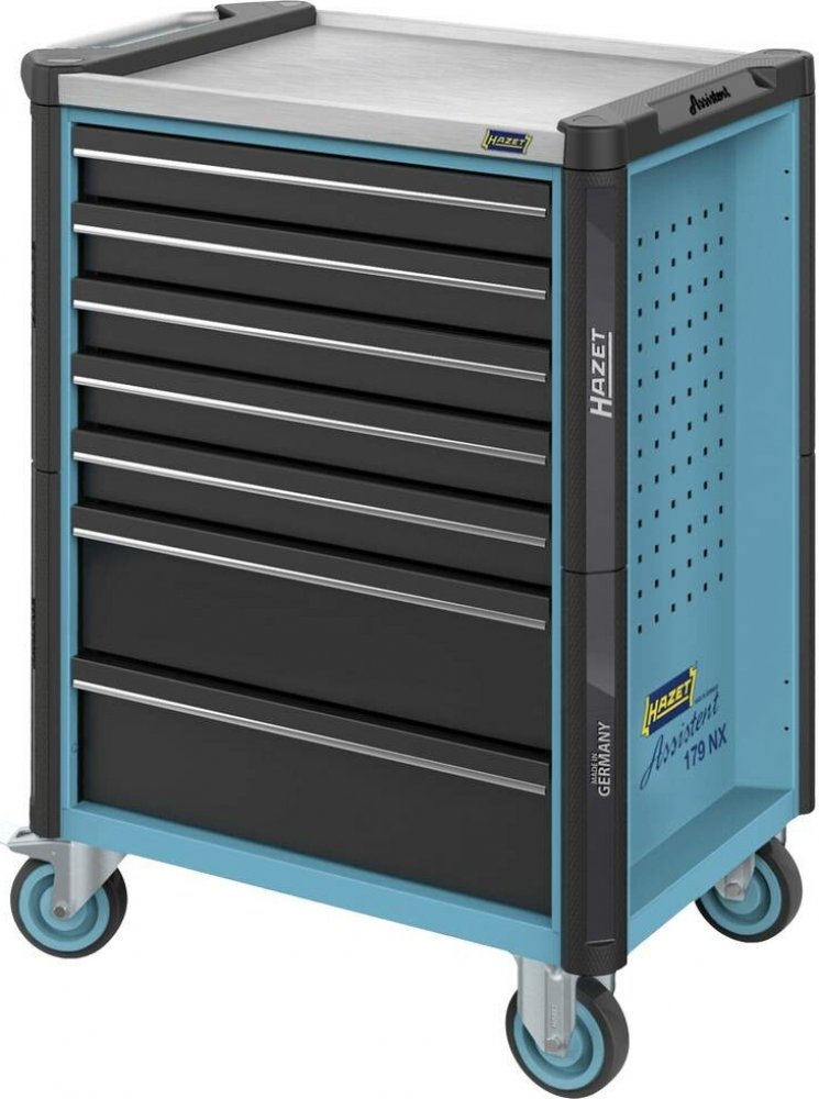 Provedení: Stabilní konstrukce z ocelového plechu, zásuvky s vodicími lištami s kuličkovými ložisky, úplným výsuvem, jednotlivé blokování proti nežádoucímu otevření během přesunu, s automatickým zavíráním. Základní výbava obsahuje dělicí plech pro každou zásuvku. Boční stěny mají čtvercové děrování, namontované díly budou chráněny před poškozením zataženými a v rámci rozměrů vozíku namontovanými bočními stěnami. Centrálně uzamykatelný pomocí cylindrického zámku. Se dvěma velkými kolečky uloženými na kuličkových ložiskách pro vysoká zatížení (O 125 mm), 2 otočné kolečky(O 125 mm) na jedné straně s brzdami koleček (úplné zastavení) pro stabilitu ve všech směrech. Všechna kola jsou vybavena ochranou ložiska, která ložiska chrání před nečistotami a nitěmi. Svislá průběžná ochrana hran na všech čtyřech stranách vozidla. Povrch odolný proti poškrábání, práškové lakování, korpus v modré barvě Hazet, zásuvky černé.